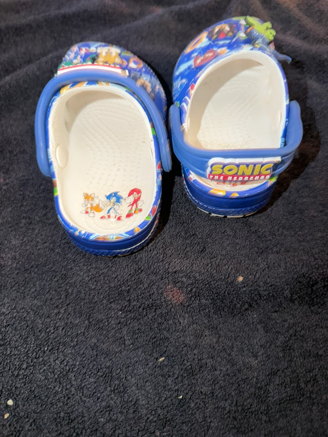 These blue Crocs feature Sonic the Hedgehog designs and charms! They are in good condition and ready for a new home! The back strap says 'SONIC THE HEDGEHOG'.