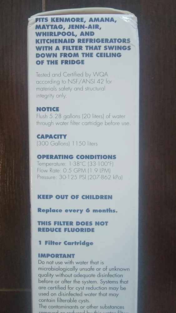 Selling a new Arrowpure refrigerator water filter. This filter fits Kenmore, Amana, Maytag, Jenn-Air, Whirlpool, and KitchenAid refrigerators with a filter that swings down from the ceiling of the fridge.
