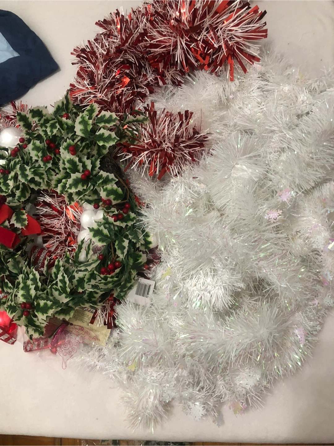 Selling a festive bundle of Christmas decorations! Includes a holly wreath, red and white garland, and some decorative bells to addy some holiday cheer to your home!