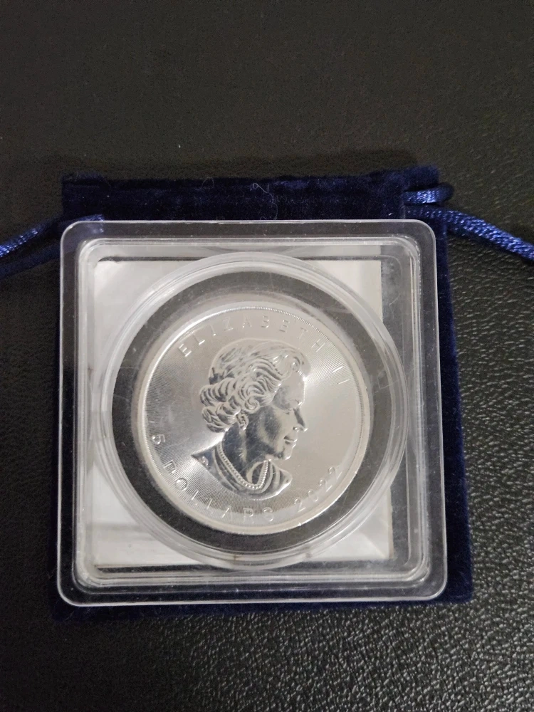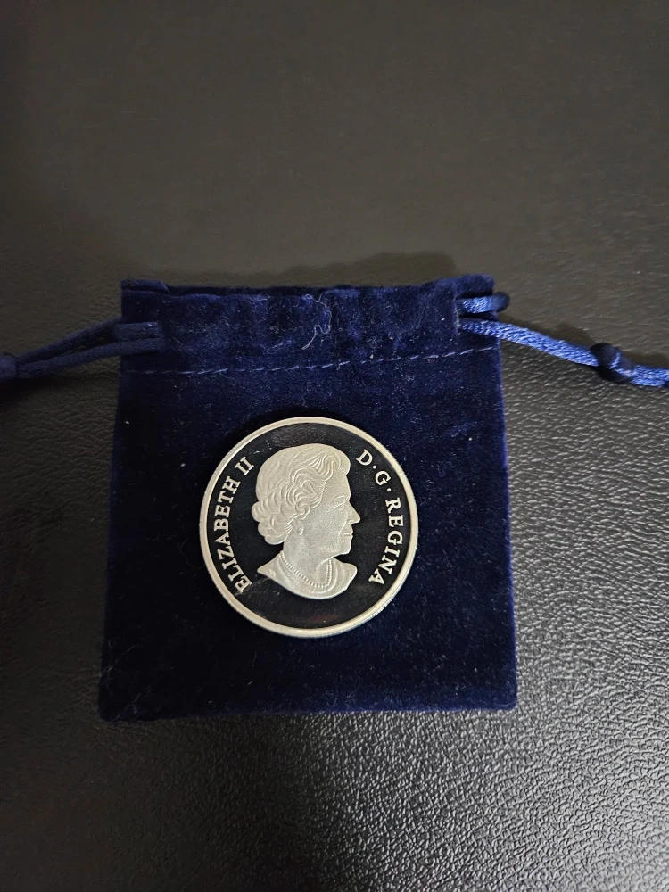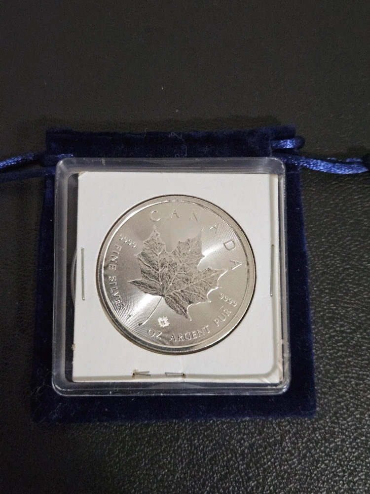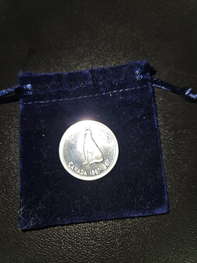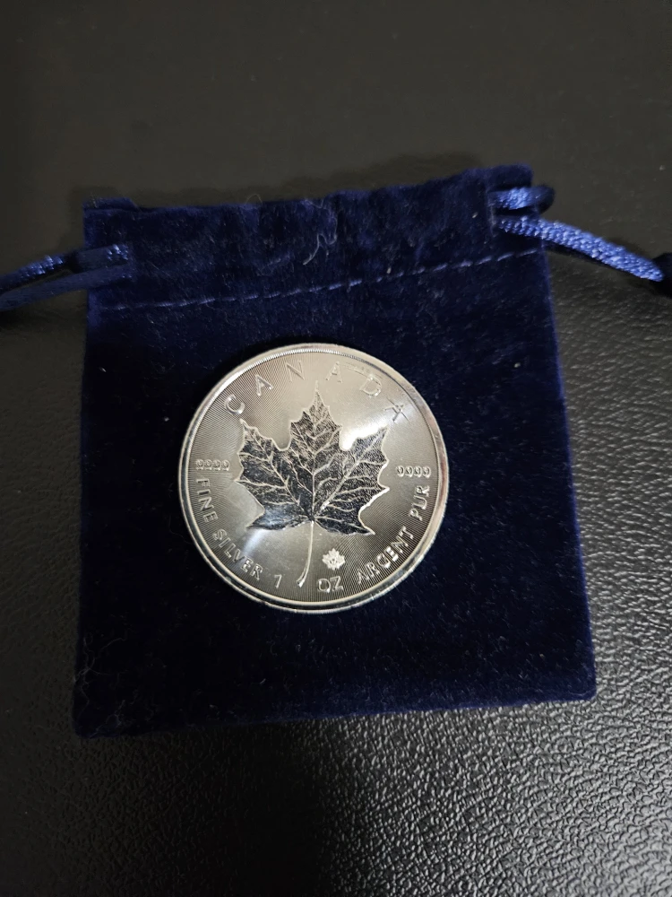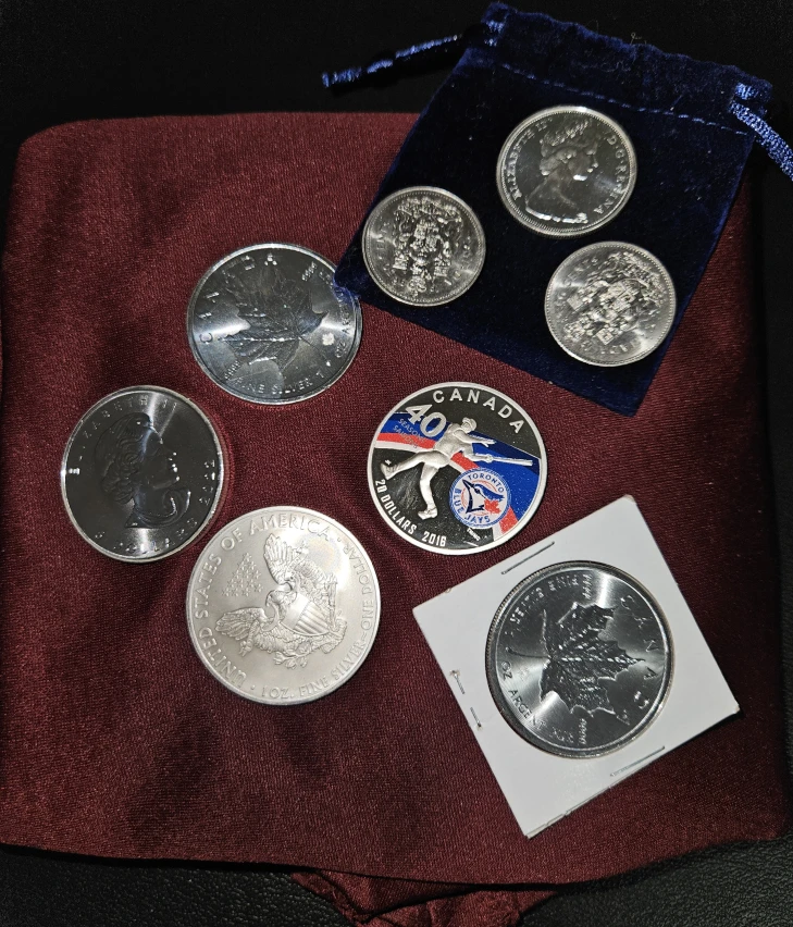 Selling a collection of Canadian silver coins from various years. Includes coins with Queen Elizabeth II, maple leaves, and other Canadian symbols. Comes with a blue velvet pouch for safekeeping