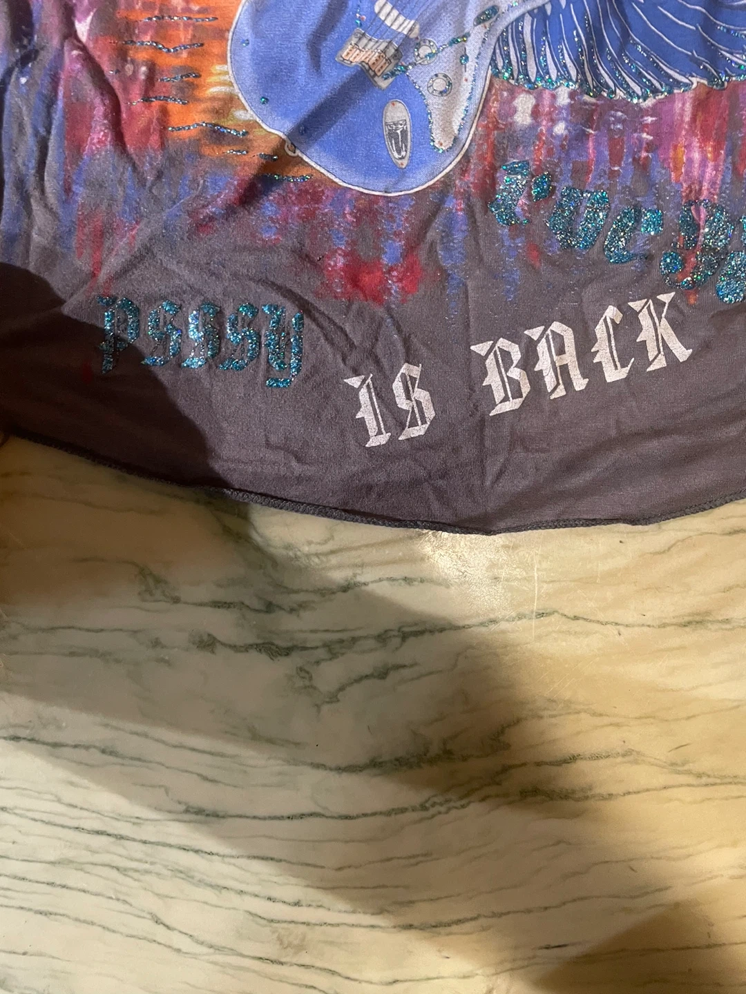 Cool graphic t-shirt featuring 'Flying Guitars' and 'Psssy is Back' designs! The shirt has a unique V-neck with zipper detail and a vibrant, colourful print. Perfect for anyone who loves rock-inspired fashion!