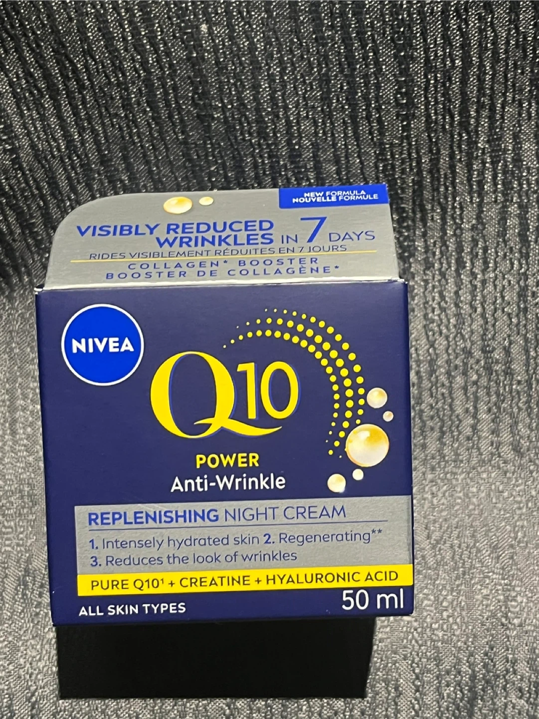 I'm selling a Nivea Q10 Power Anti-Wrinkle Replenishing Night Cream! It's a collagen booster for younger-looking skin. It visibly reduces wrinkles in 7 days. The cream contains Pure Q10, creatine, and hyaluronic acid. It comes in a 50ml container and the box is included