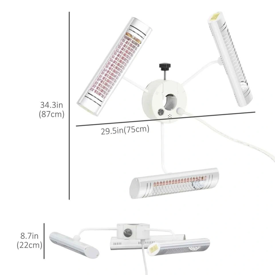 Outsunny electric patio heater with 3 heating panels and ultra low glare aluminum alloy. This clamp on infrared heater mounts to a parasol or gazebo pole and warms people directly, not the air. Three 500 W panels can be switched independently by the remote to save power. The aluminum alloy body is IPX5 rated for rain and snow, and the silent operation suits patios where fan noise would be annoying. Installation is simple: set the heater around a sturdy pole, tighten the knob, aim the panels toward seating, and plug into a standard 110 to 120 V outlet. The power cord is 2.1 m long; keep clear of fabrics and foliage during use.