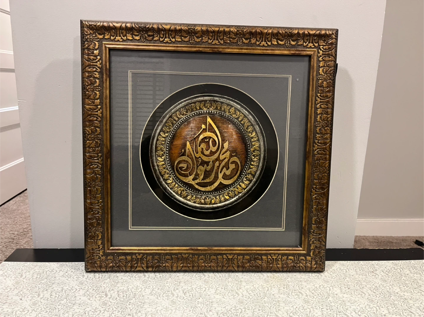 Beautiful framed piece featuring Islamic calligraphy. The frame is ornate and in good condition. A lovely addition to any home!