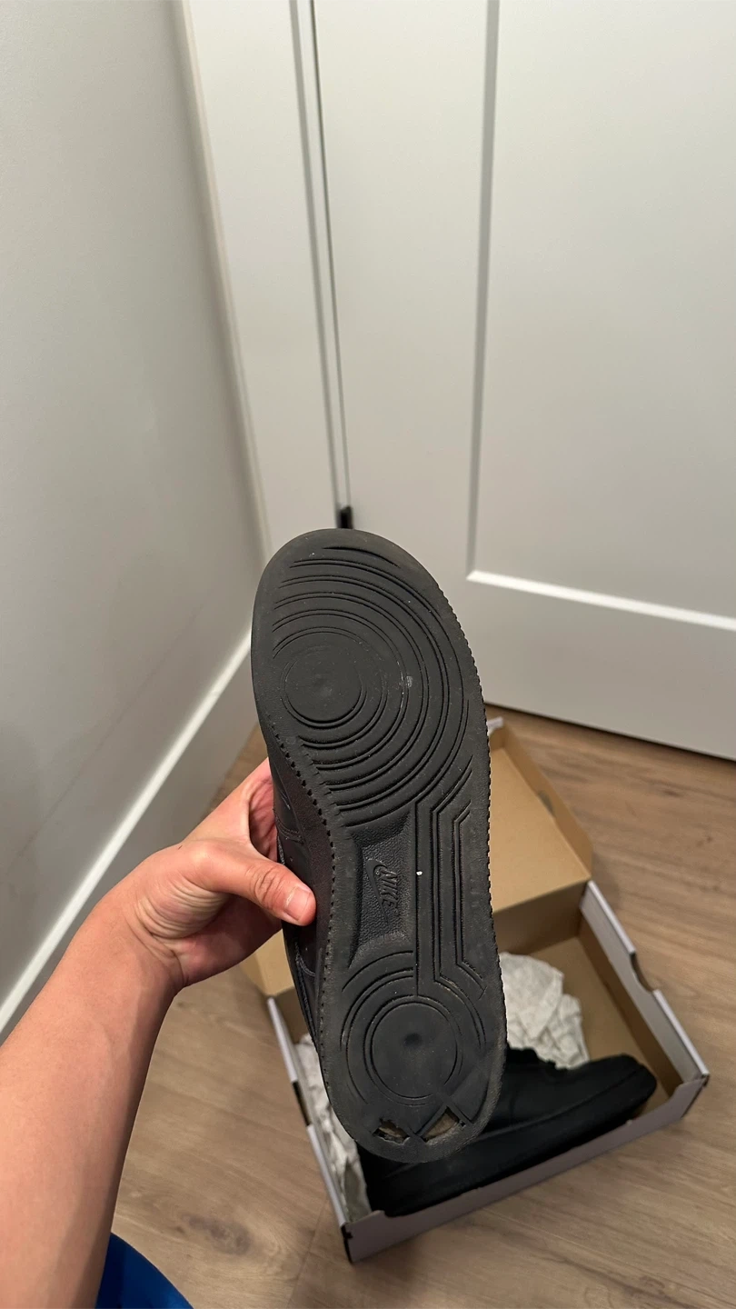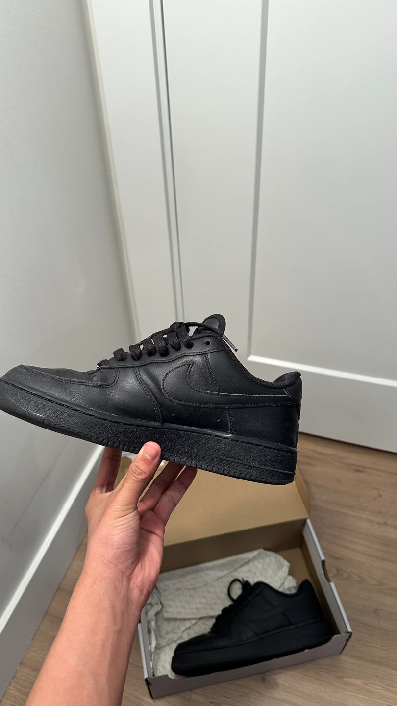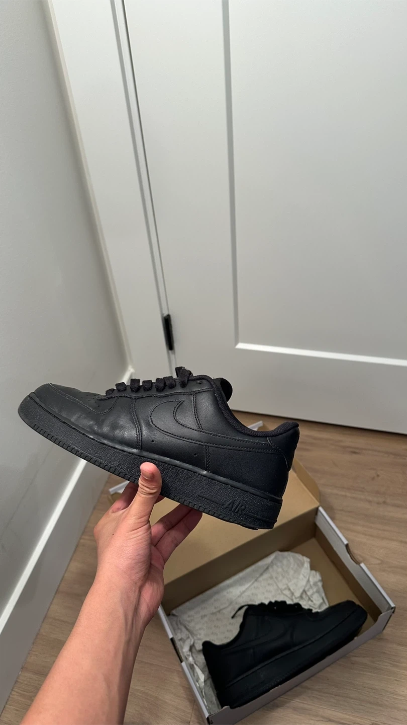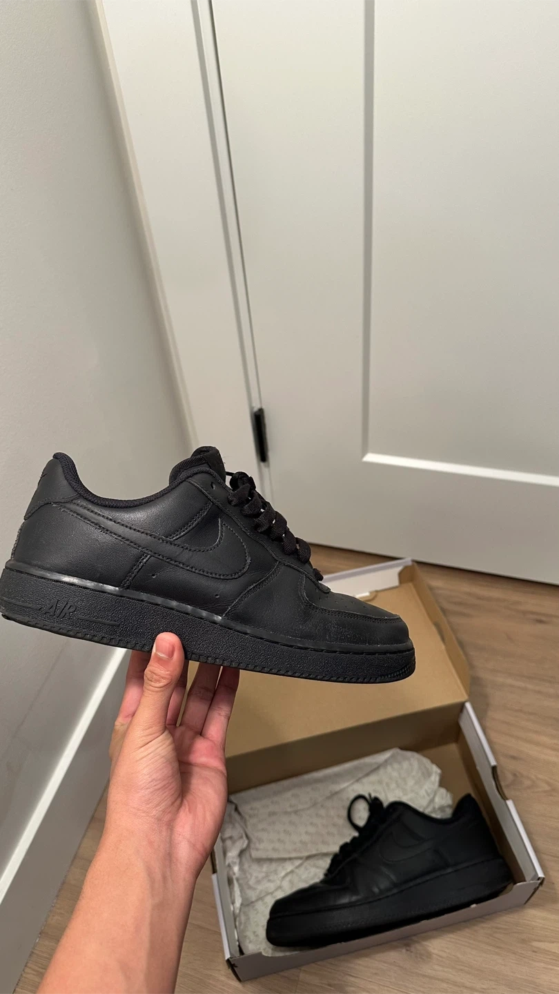 Selling a pair of black Nike Air Force 1s! They're in good condition with some signs of wear on the soles as you can see in the photos. The box is included