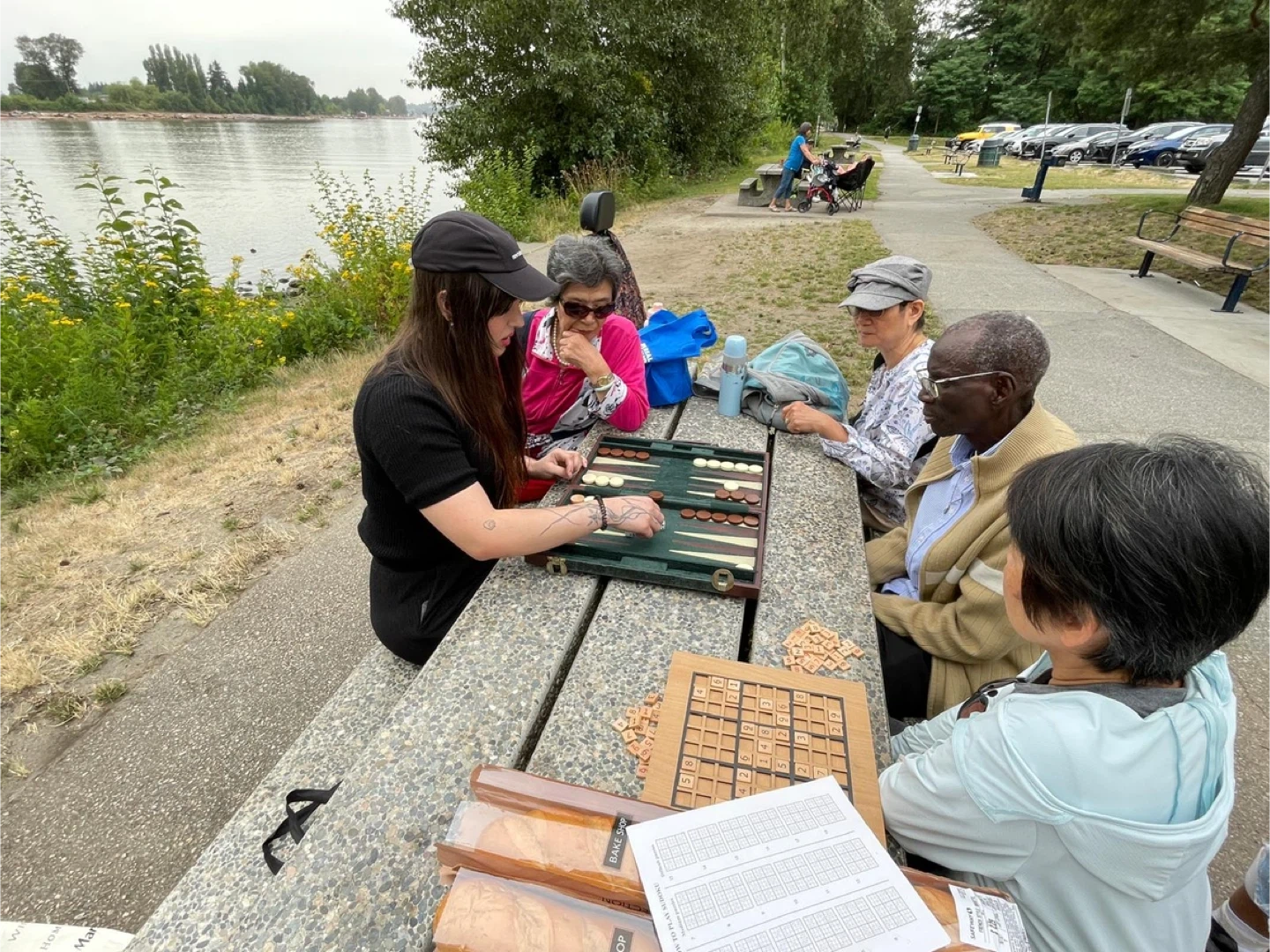 Selling a backgammon set in good condition. Perfect for game nights with friends and family! Two white checkers have been replaced by checkers from other sets. Last photo is me playing backgammon with some seniors at my most recent job.