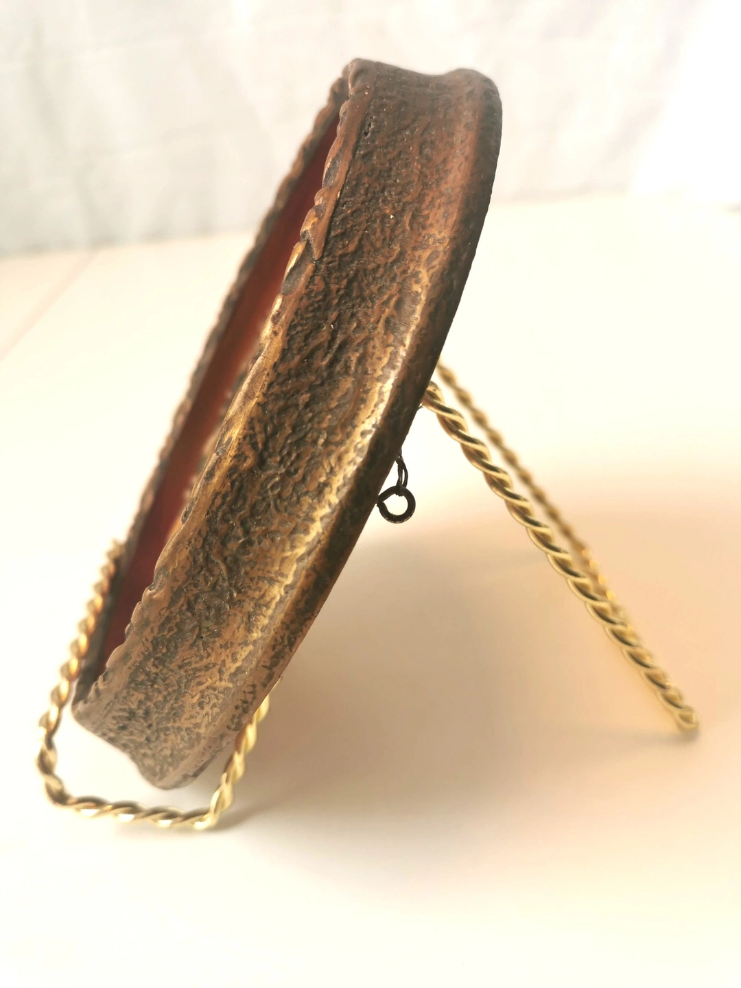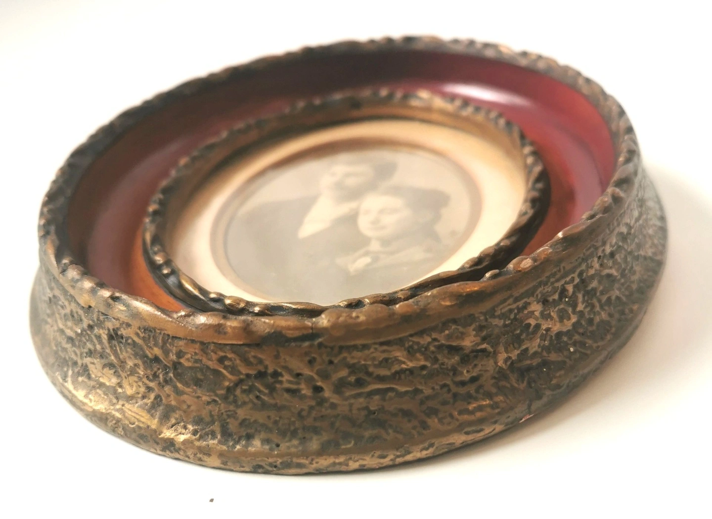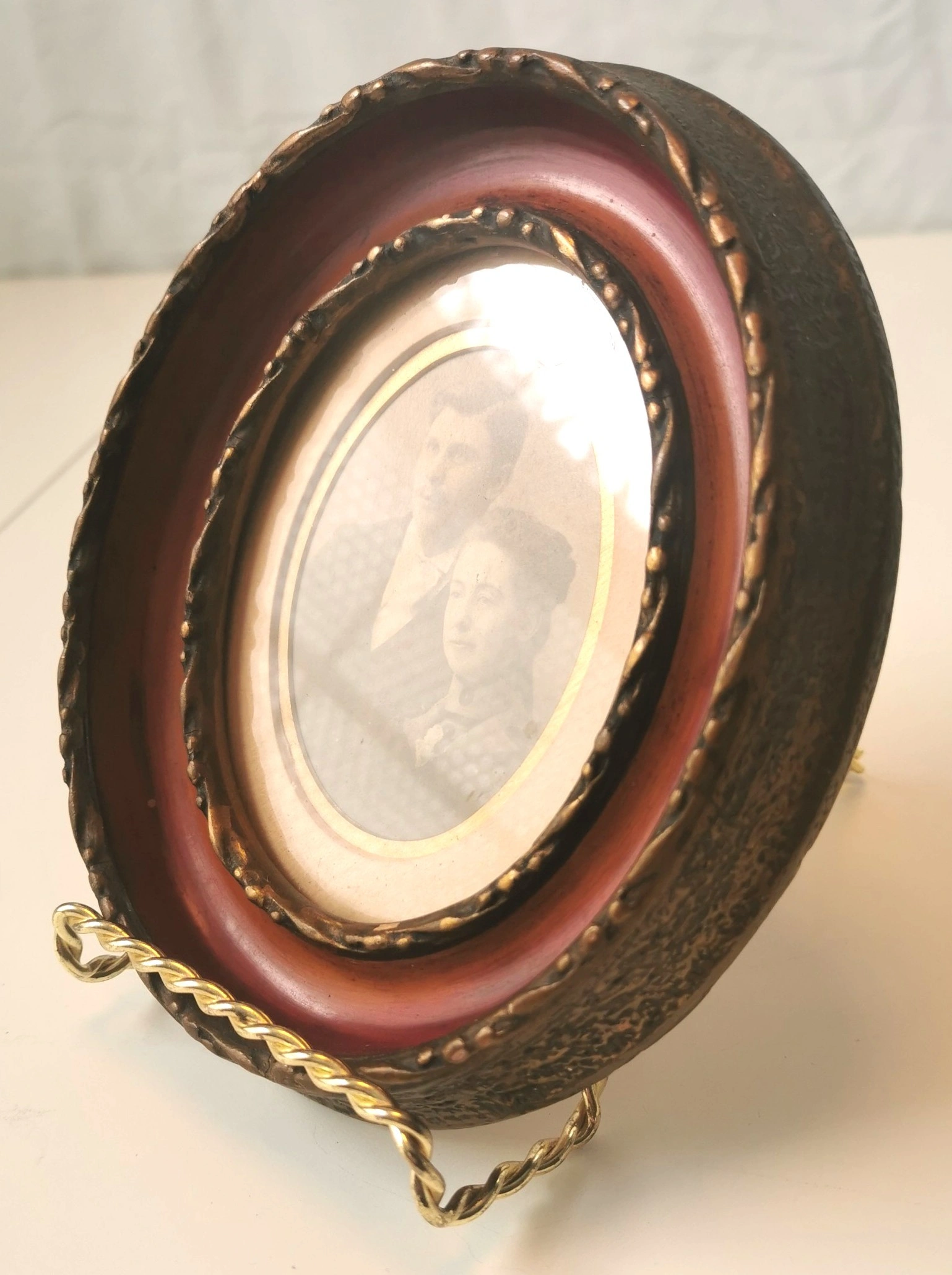 Frame Style: Oval, deep-set frame with a textured, antiqued gold/bronze finish and a reddish-brown inner border. Classic Victorian/Edwardian design.