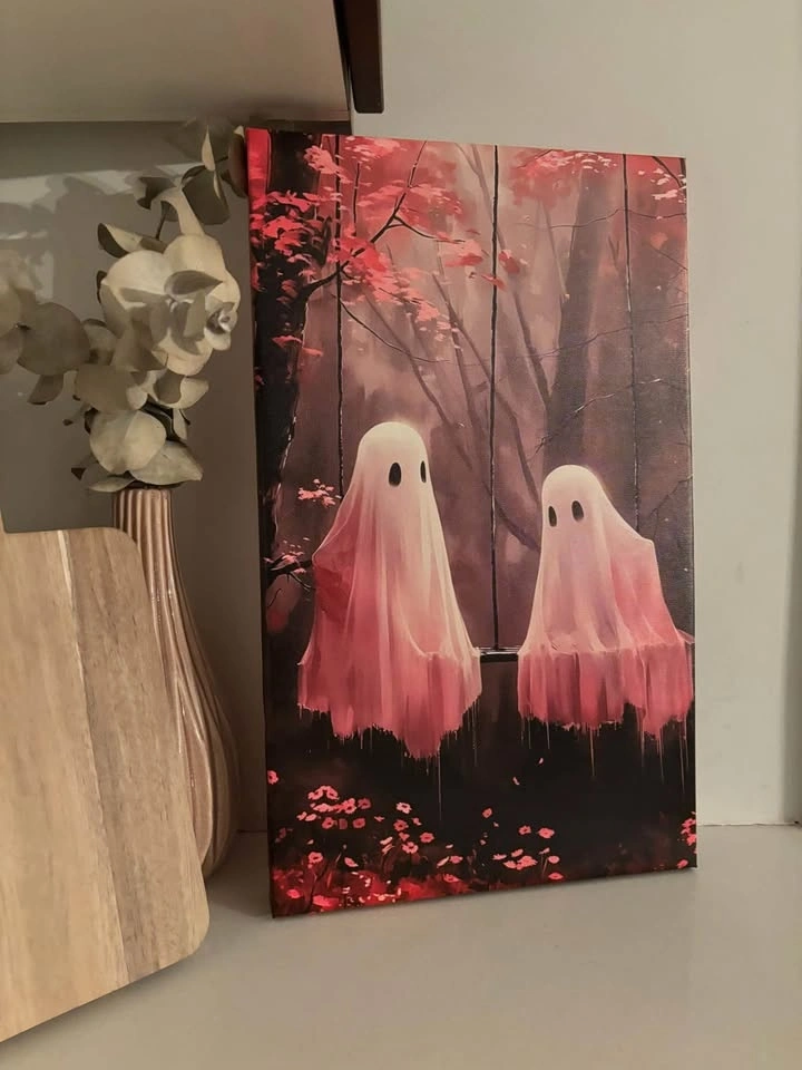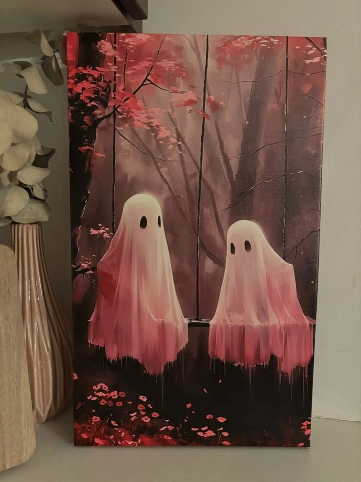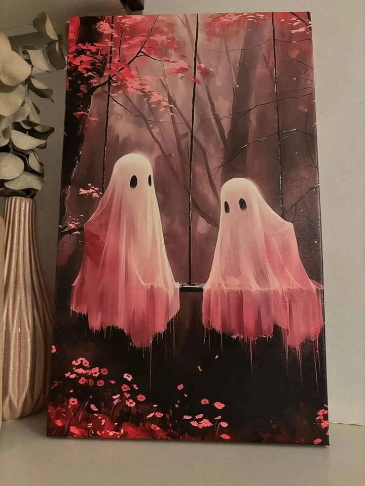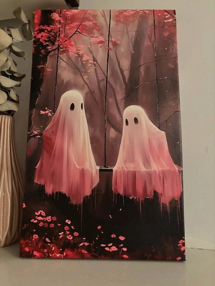 Super cute pink Halloween ghosts on swing (print on canvas). Framed onto 19.6”x11.7”x1.5” wooden frame. Light weight and ready to hang.