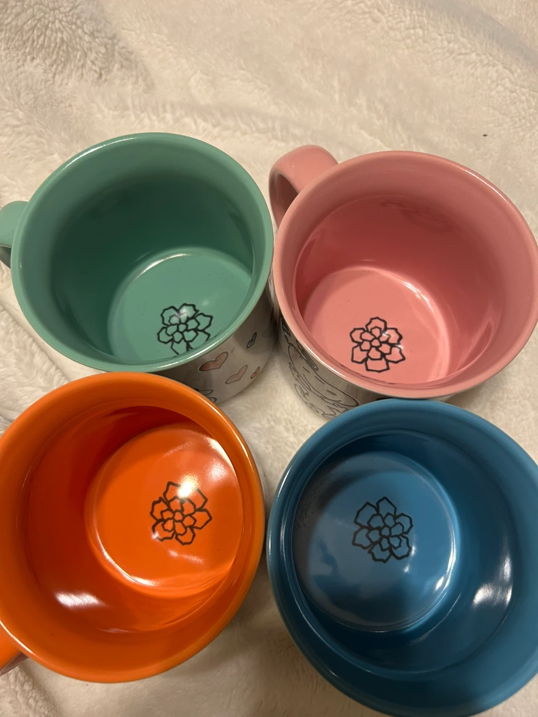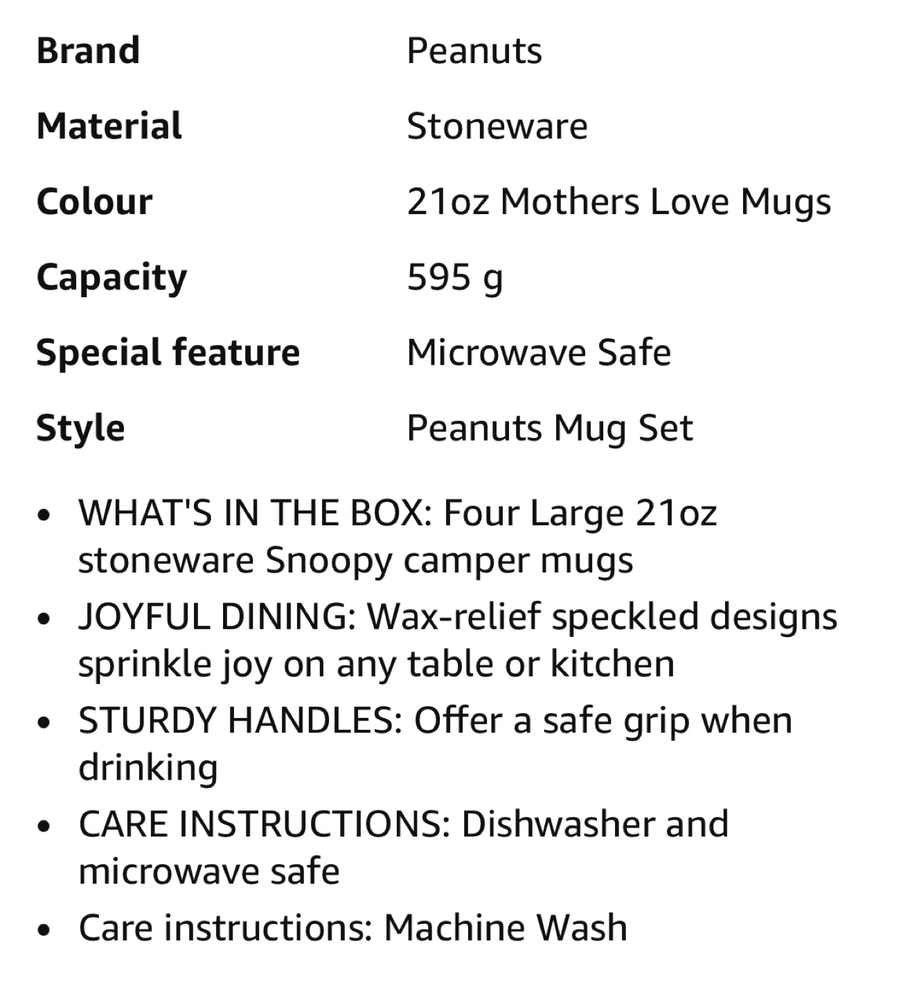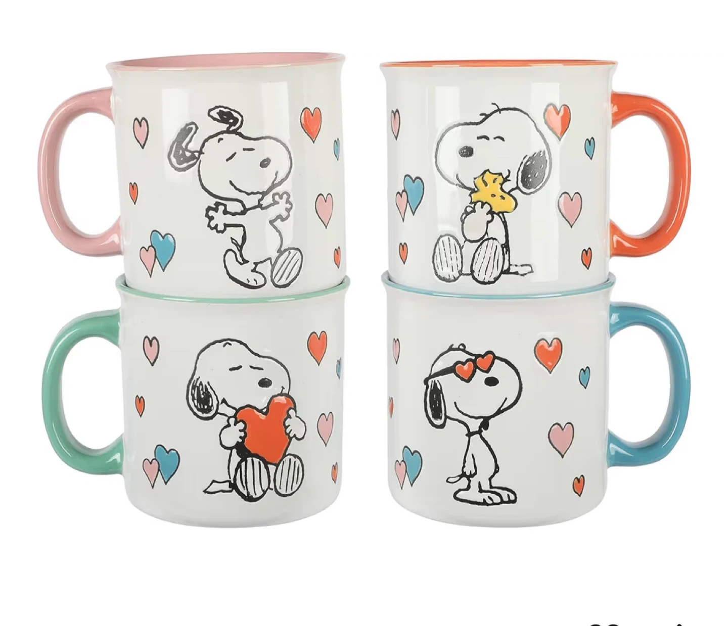Selling a set of four large, 21 oz Peanuts Snoopy Mothers Love mugs! These stoneware mugs feature adorable Snoopy designs and colourful accents. They are microwave and dishwasher safe, making them super convenient for everyday use. Each mug has a sturdy handle for a comfortable grip. Add some joy to your table or kitchen with these delightful mugs!