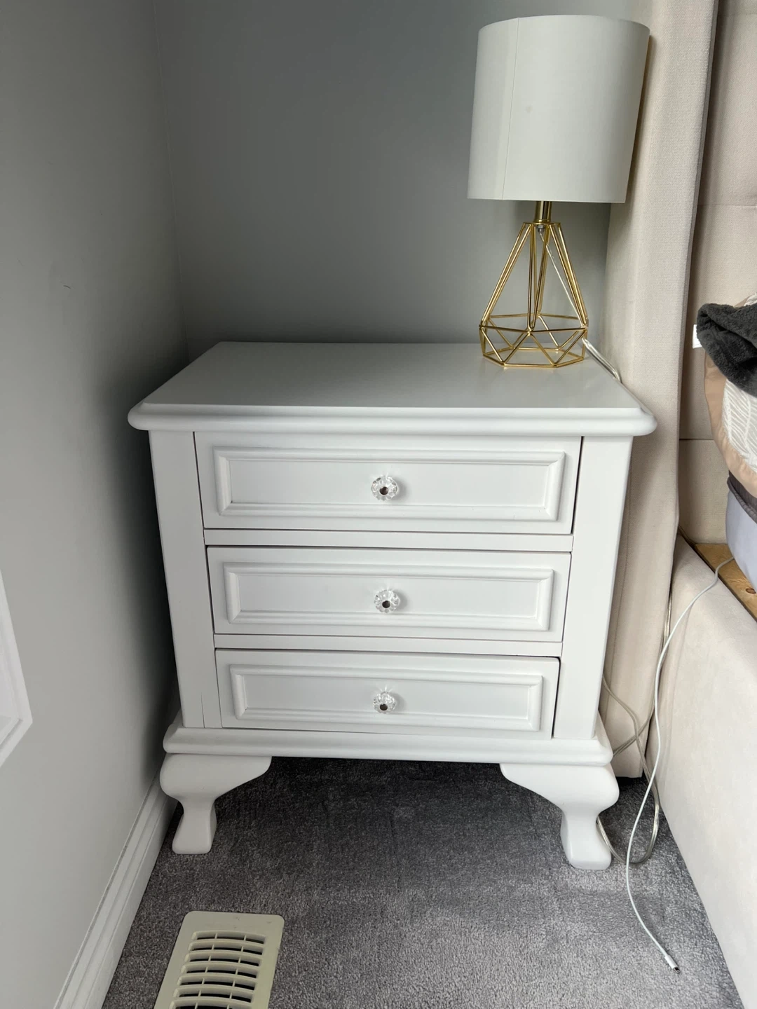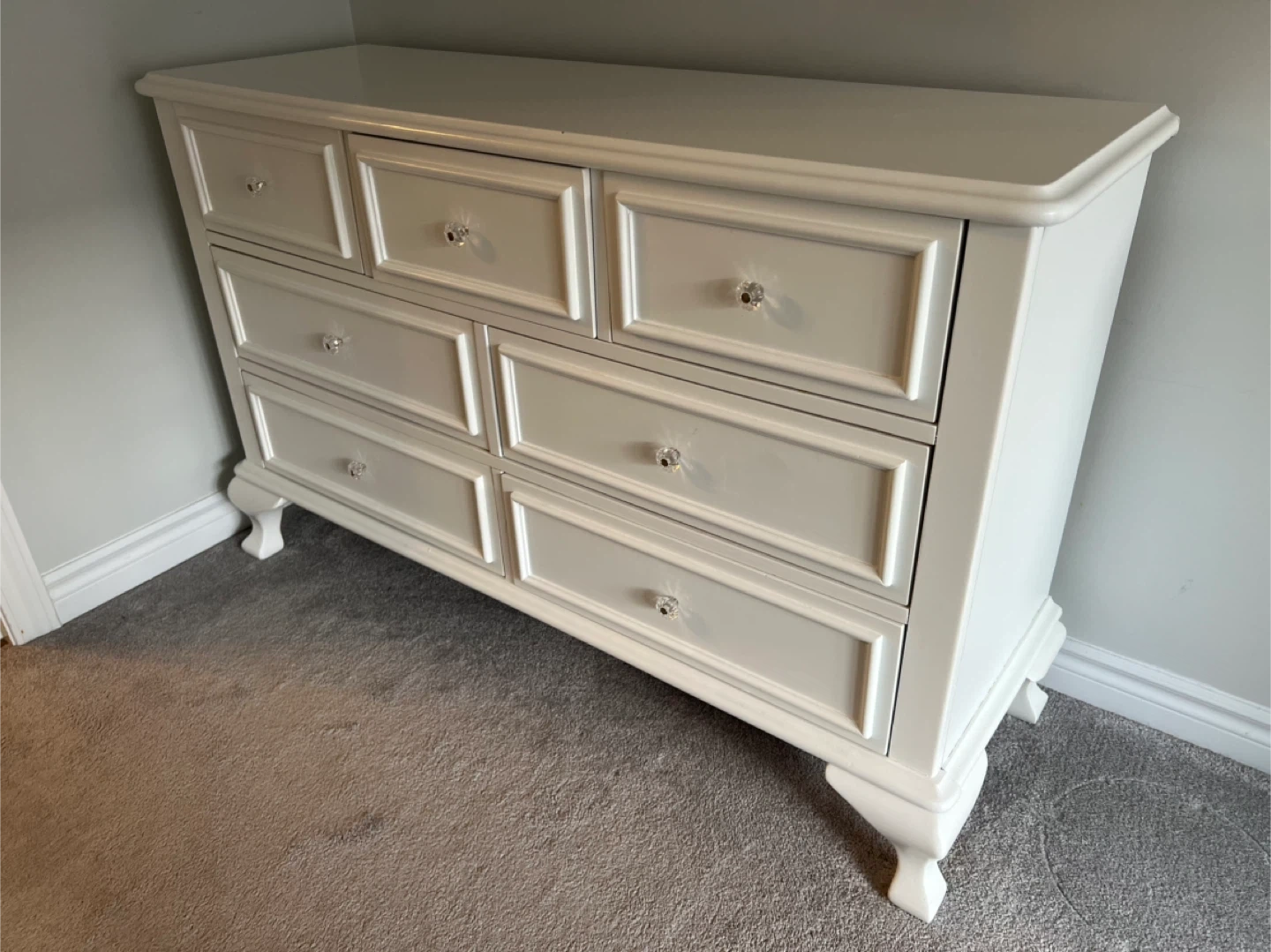 Selling a charming white dresser with 7 drawers and a matching nightstand! Both pieces feature crystal-like knobs and a classic design. They're in great condition and would add a touch of elegance to any bedroom