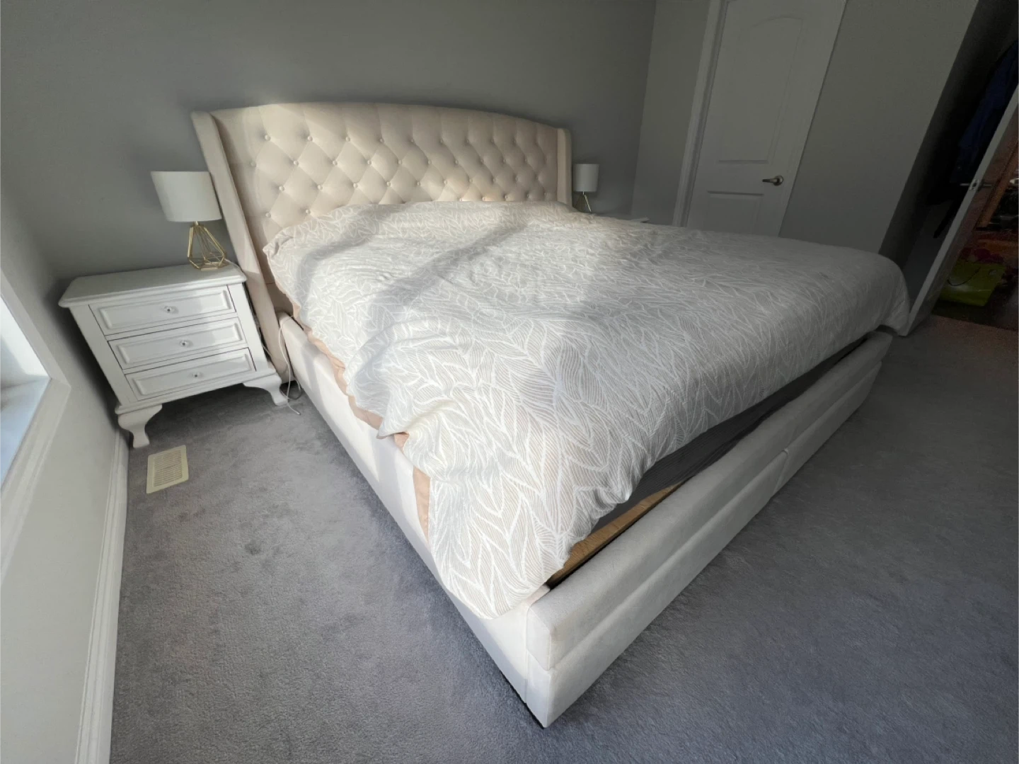 Selling a beautiful king size bed frame from Structube! It's in great condition and features convenient storage drawers built into the base. Perfect for adding a touch of elegance to your bedroom while maximizing space.