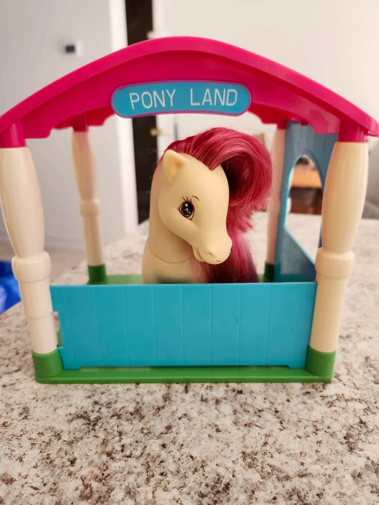 Selling a cute Strawberry Shortcake Berry Pretty Pony figure with a Pony Land stable. The pony has pink hair and a pink flower accessory. Great for kids who love ponies!