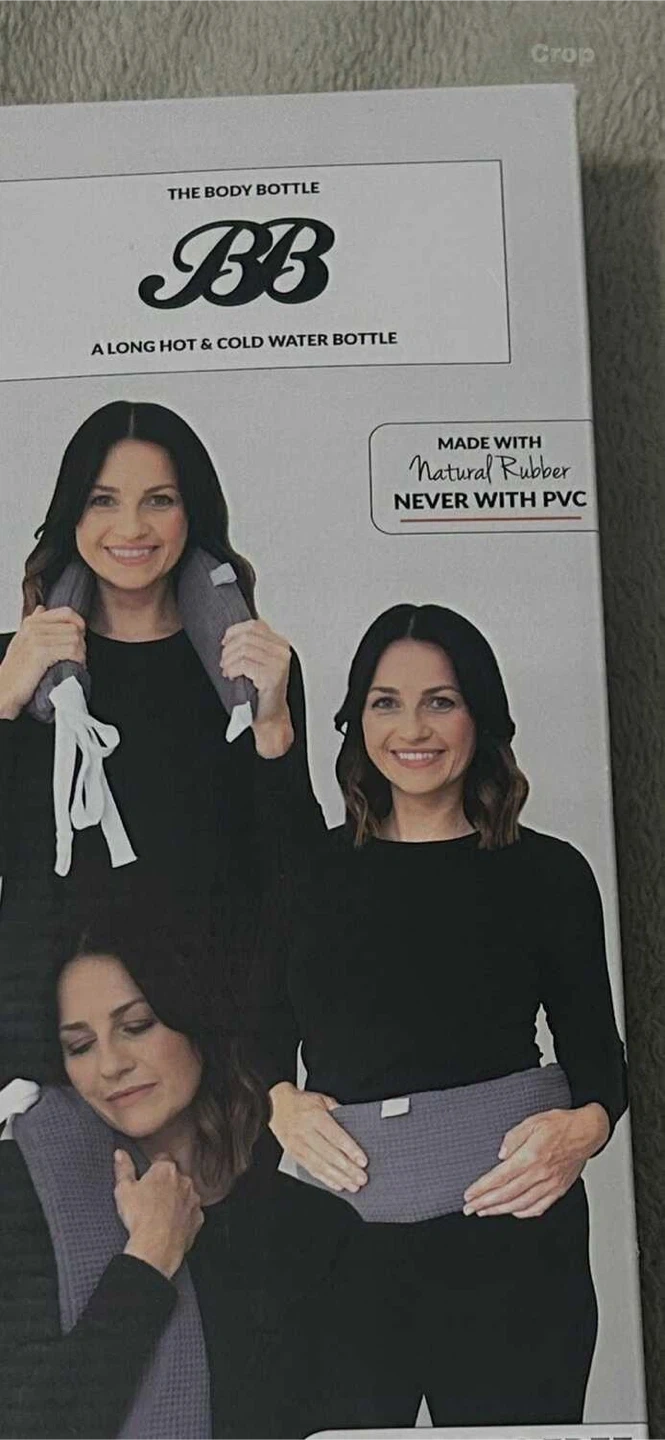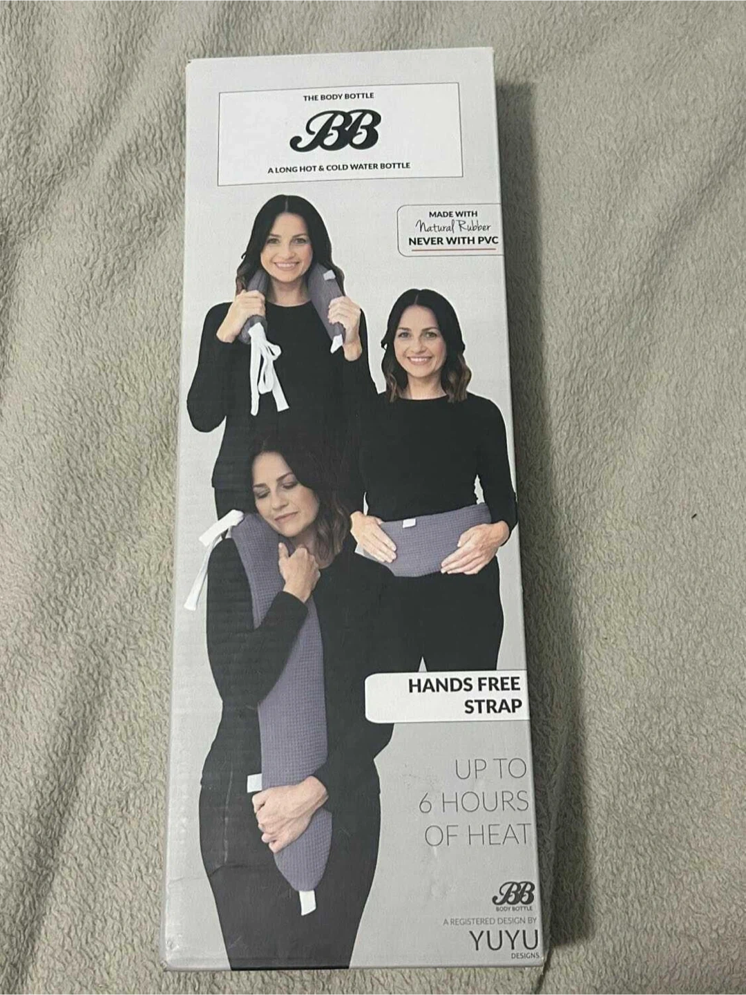 I'm selling a YuYu Body Bottle. It's a long hot and cold water bottle, made with natural rubber and never with PVC. It also has a hands-free strap and can provide up to 6 hours of heat. It's a registered design by YuYu Designs