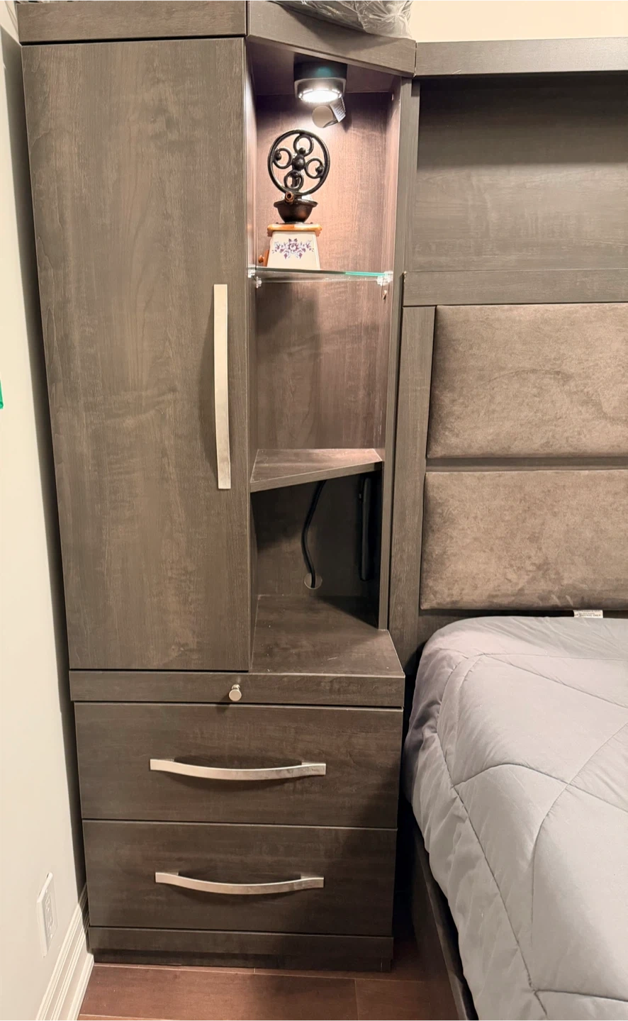 Selling a bedroom set that features a headboard with built-in storage! It's a great way to maximize space and keep your bedside essentials within easy reach. The set includes shelving and drawers for added convenience. Perfect for organizing your books, lamps, and other personal items right at your bedside