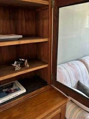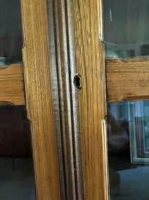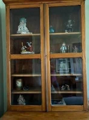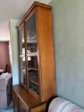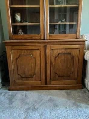 Excellent used condition, vintage antique bookcase with lower hutch cupboard. Bevelled glass doors. Key & lock for both upper & lower doors. 4 upper shelves, 1 lower shelf inside. Separates for easier transport.