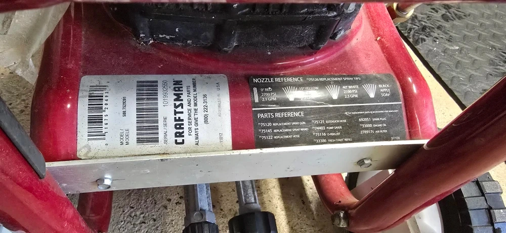 Selling a Craftsman pressure washer. It delivers 2700 PSI at 2.3 Max GPM. It has a nozzle reference and parts reference label for easy maintenance. New Carb and water pump