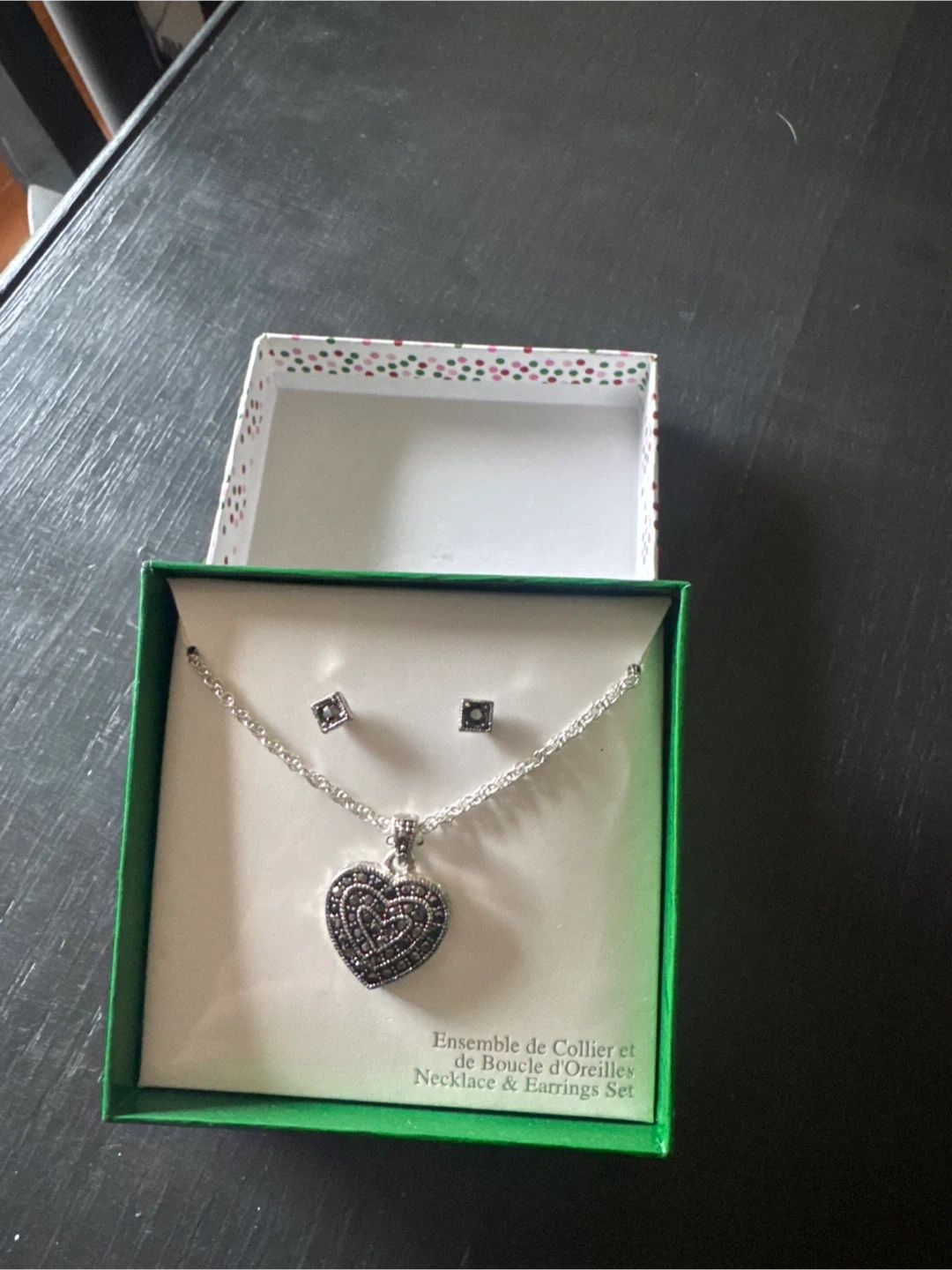 Selling a cute necklace and earrings set! It's a silver-tone necklace with a heart pendant and matching stud earrings. Comes in its original box, perfect for gifting or treating yourself