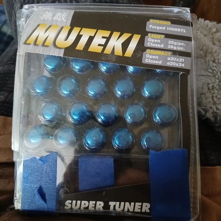 Selling a set of Muteki Super Tuner lug nuts in chrome blue! They are forged 1008STL, making them strong and reliable.