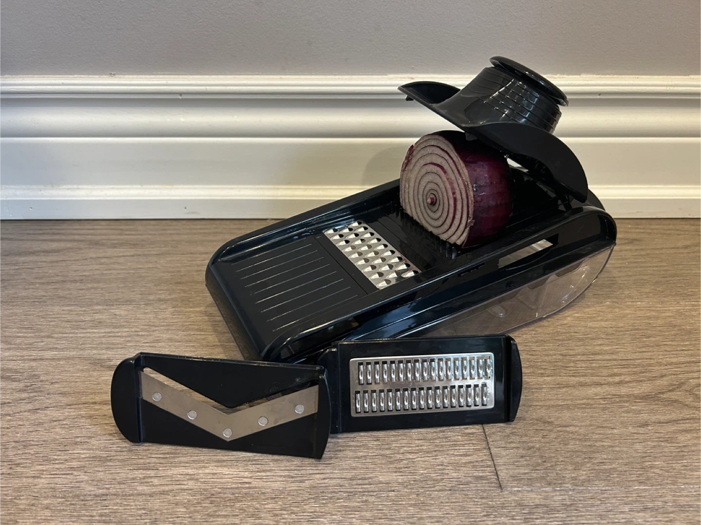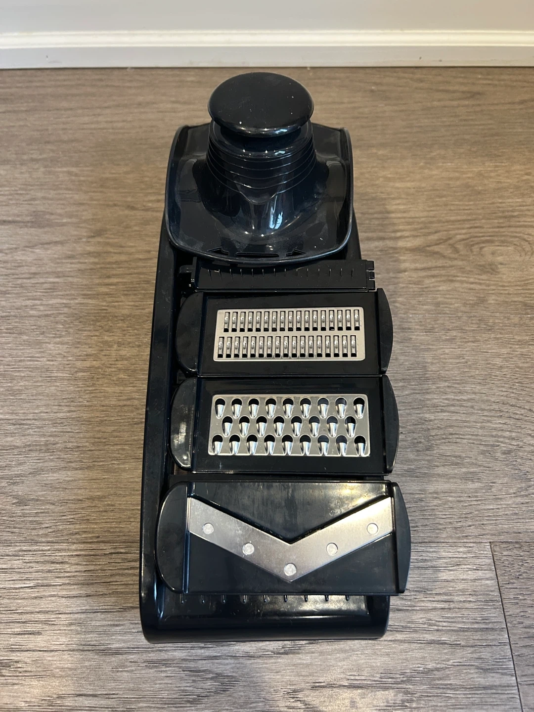 This is a mandoline slicer in black. It is in good condition and comes with four blades for different slicing options. It has a clear compartment attached below to contain all the vegetables. It's a handy tool for any kitchen!