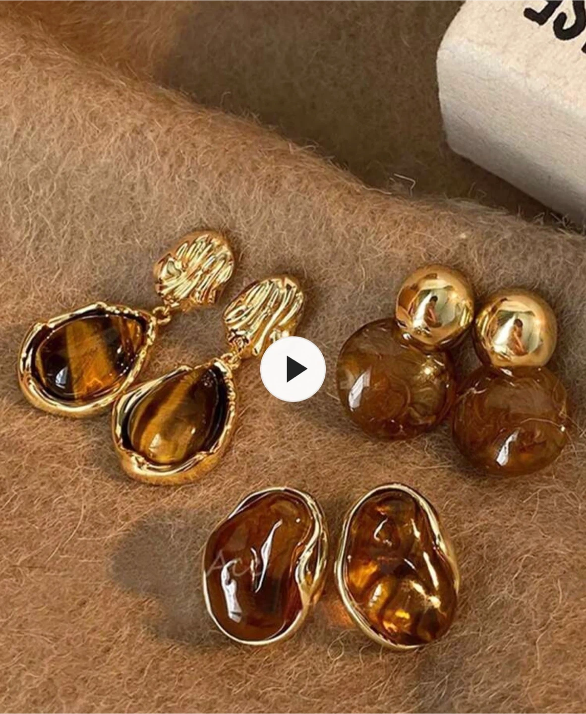 Here's a set of gold-tone earrings! The set includes drop earrings with what looks like tiger's eye stones, round stud earrings, and what appear to be amber-coloured stone studs