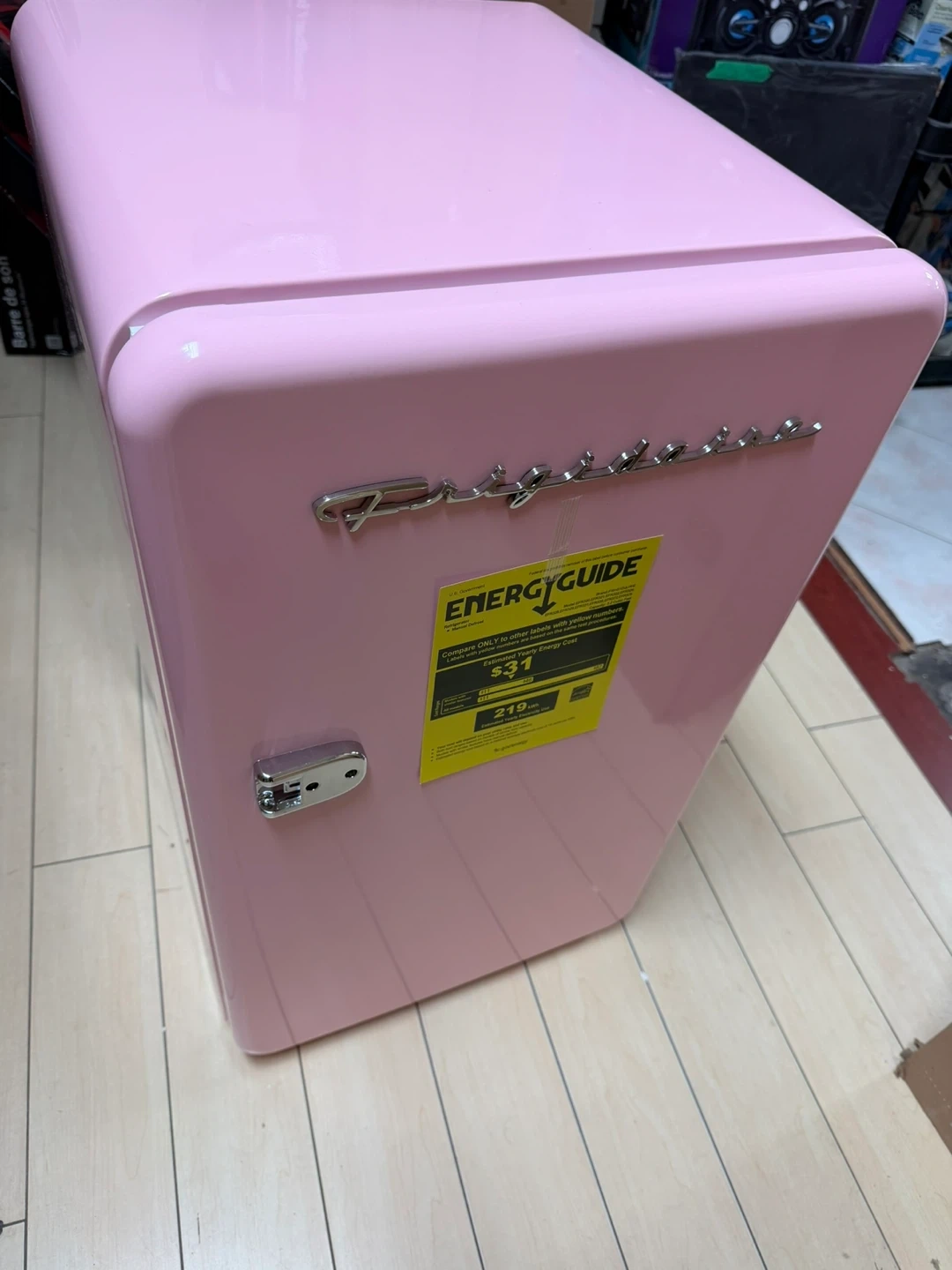 Selling a cute pink Frigidaire retro mini fridge! It's in great condition and perfect for a dorm room, office, or just to add a pop of colour to your space