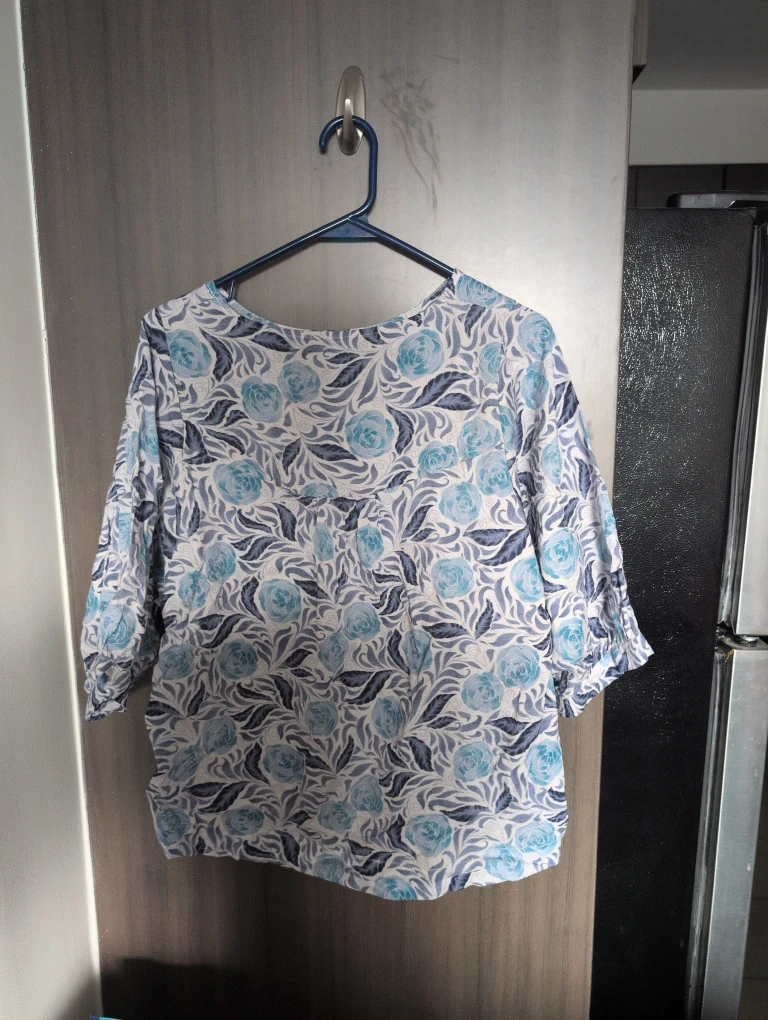 This is a lovely blouse with a floral print, perfect for adding a touch of elegance to your wardrobe! The material is lightweight and comfortable, making it ideal for everyday wear. It features a beautiful blue and white floral pattern. It's new!
