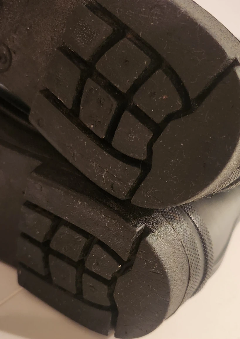 These are a pair of black heavy old school rubber/rain boots. They have a buckle detail on the side. Perfect for those rainy days!
