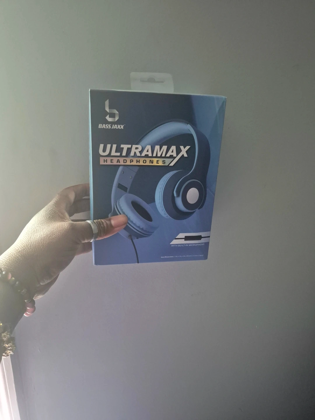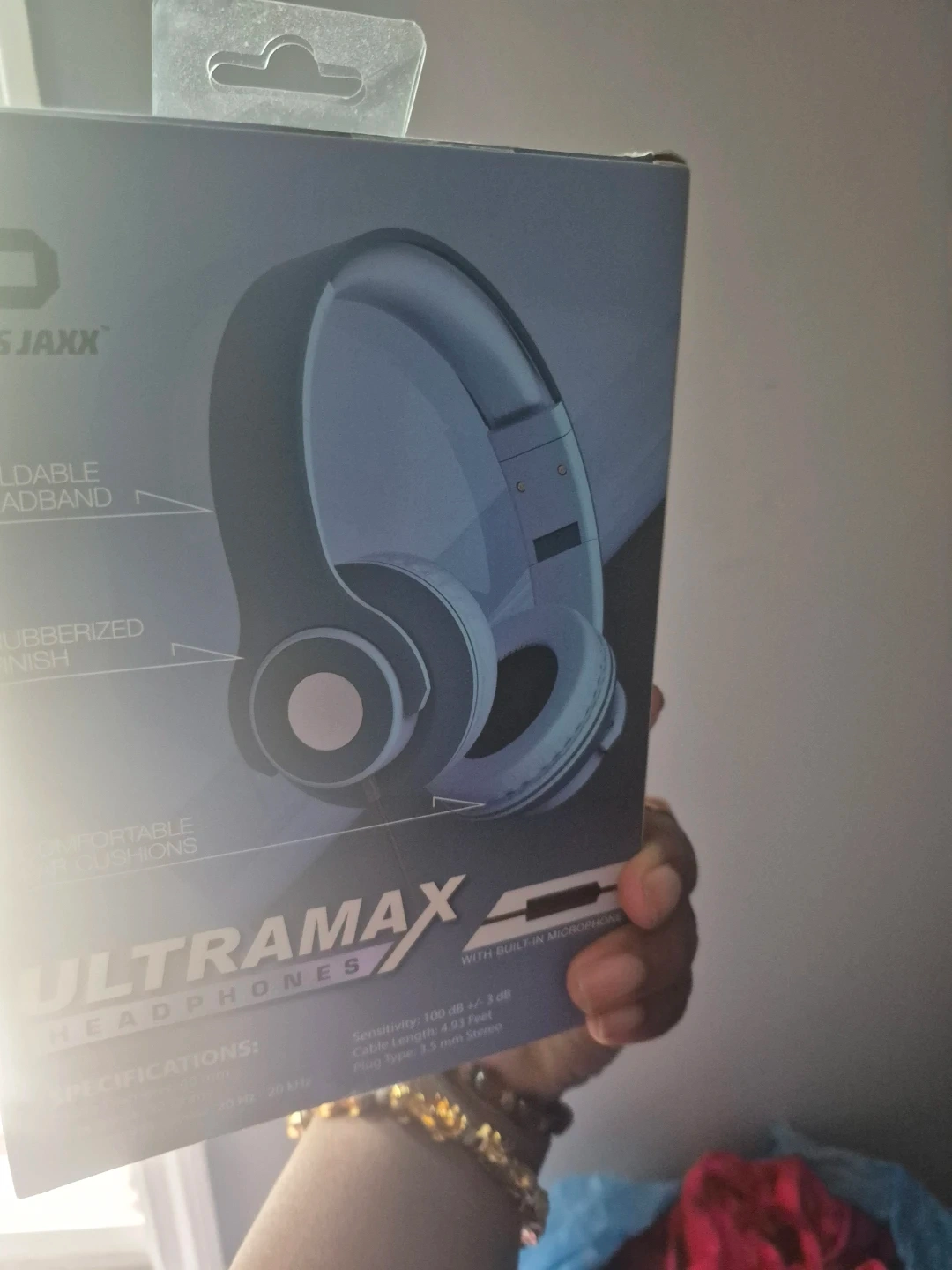 Selling a brand new pair of Bass Jaxx Ultramax headphones, still in the box! These headphones feature a foldable headband, comfortable ear cushions, and a rubberized finish. They also have a built-in microphone. The specifications include a sensitivity of 103 dB +/- 3 dB, a cable length of 4 feet, and a 3.5 mm stereo plug type