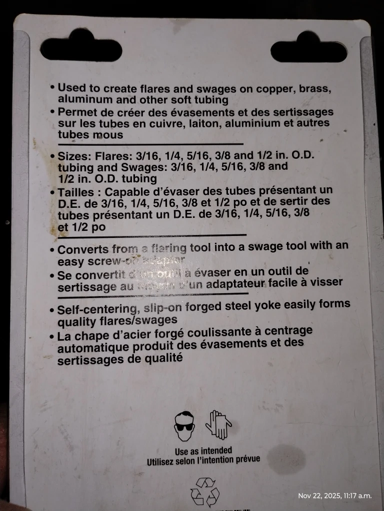 New Power Fist Flaring and Swage Tool Kit for creating flares and swages on copper, brass, aluminum, and other soft tubing. It converts from a flaring tool into a swage tool with an easy screw-on adapter. Self-centering, slip-on forged steel yoke easily forms quality flares/swages. Sizes for flares: 3/16, 1/4, 5/16, 3/8 and 1/2 in. O.D. tubing and swages: 3/16, 1/4, 5/16, 3/8 and 1/2 in. O.D. tubing