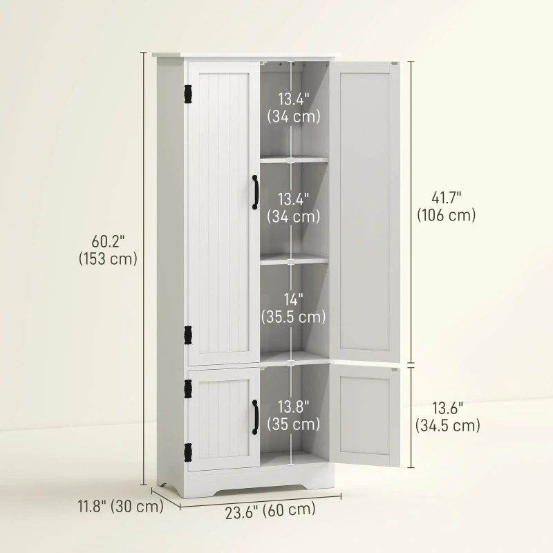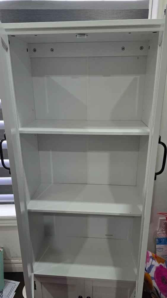 I'm selling a Brand new tall farmhouse-style cabinet in white! It has a charming, rustic look with black hardware. The cabinet features both open shelving and closed storage with doors, offering versatile storage options. Dimensions are approximately 60" tall, 23.6" wide, and 11.8" deep.
