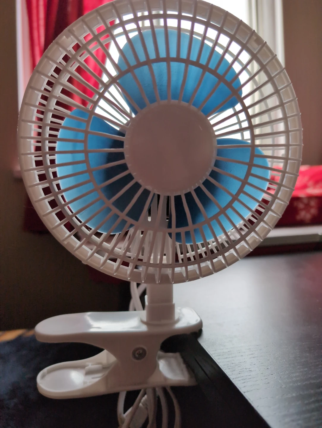 Here's a handy clip-on mini desk fan! It's perfect for keeping cool at your desk or clipping onto a shelf, and it's super easy to move around where you need it.