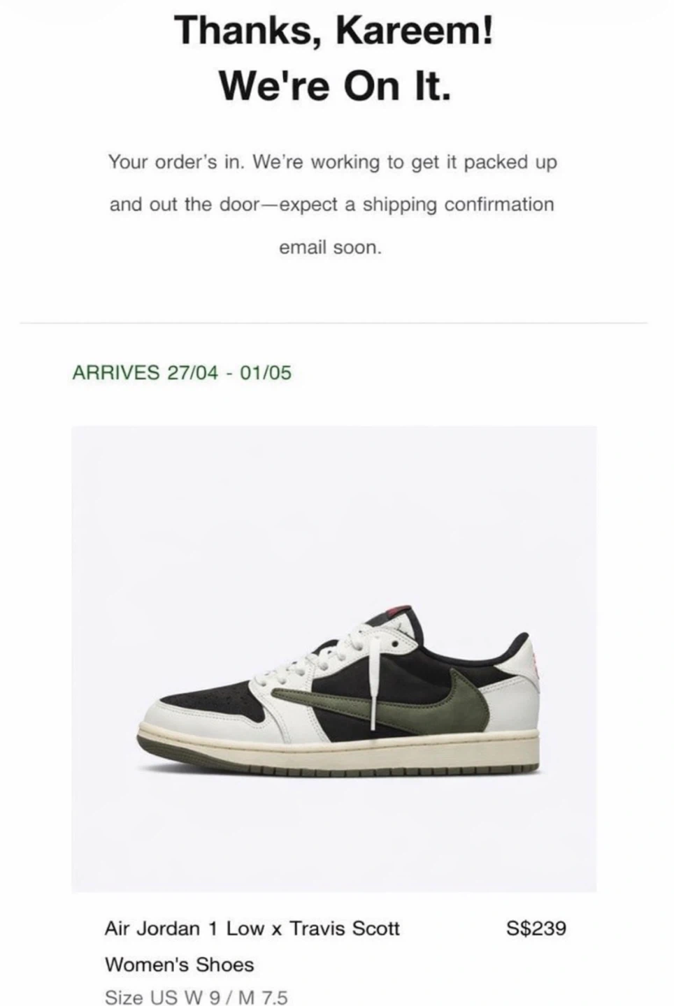 Travis Scott Air Jordan 1 Low Olive Online Receipt