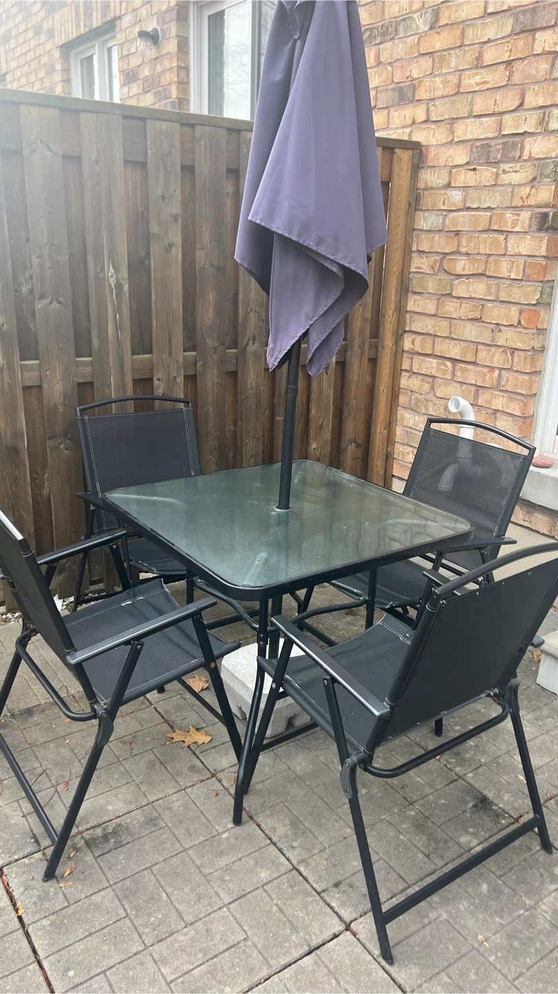Selling a patio table set that includes four chairs and an umbrella. Perfect for enjoying the outdoors on those sunny days! The chairs are foldable for easy storage when not in use.