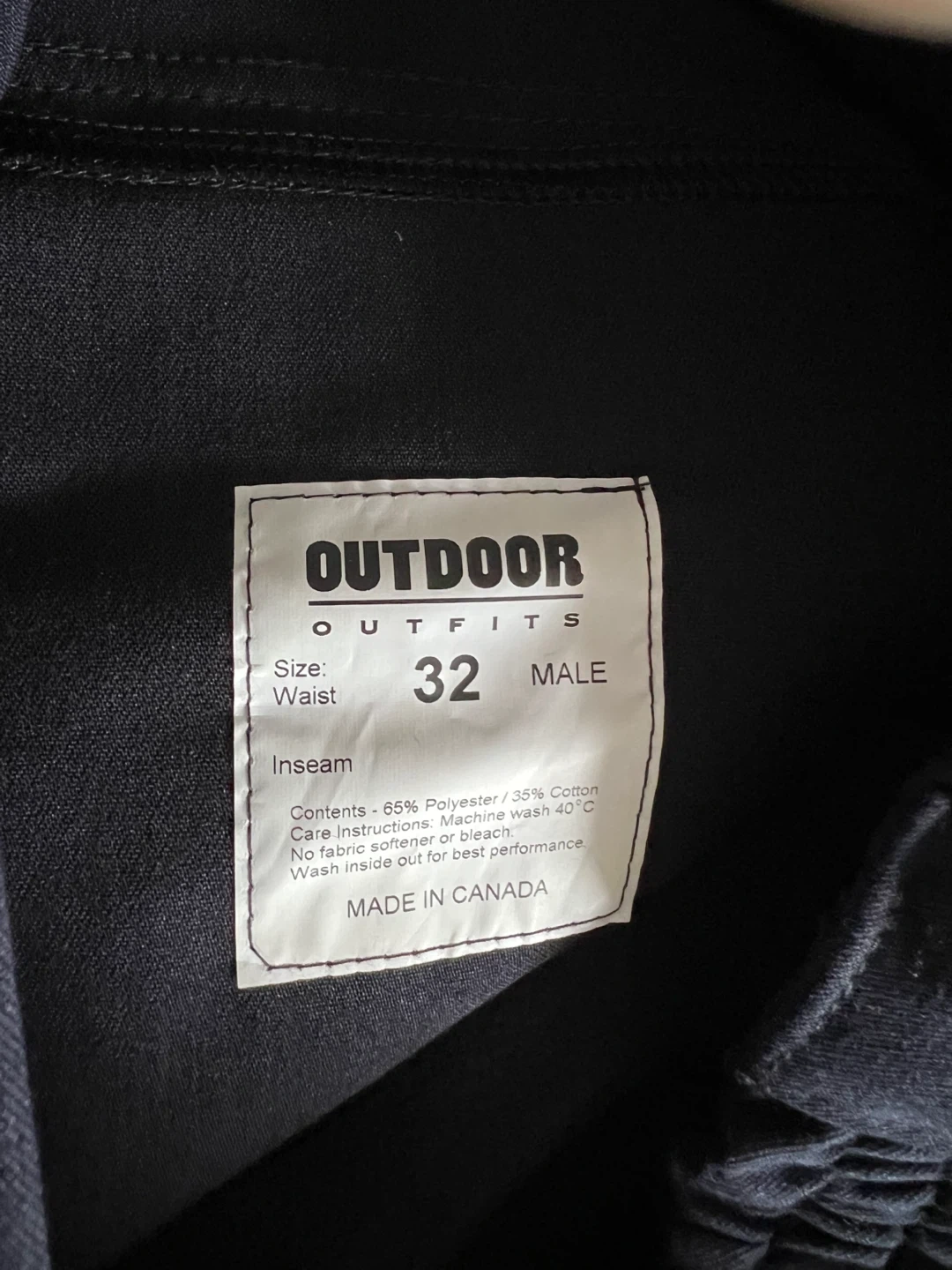 Outdoor Outfits pants in size 32. They are navy blue and made in Canada. The material is 65% polyester and 35% cotton. They are EMT shorts, padded seat, reflective band on the legs.