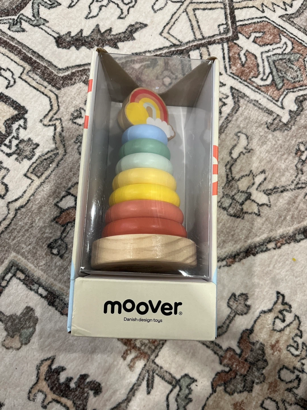 This is a Moover rainbow stacking tower, a Danish design toy that's perfect for little ones! It comes in its original box and is in great condition. It’s a fun and educational toy to help develop your child's motor skills and hand-eye coordination