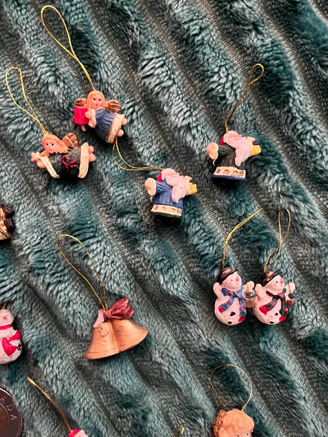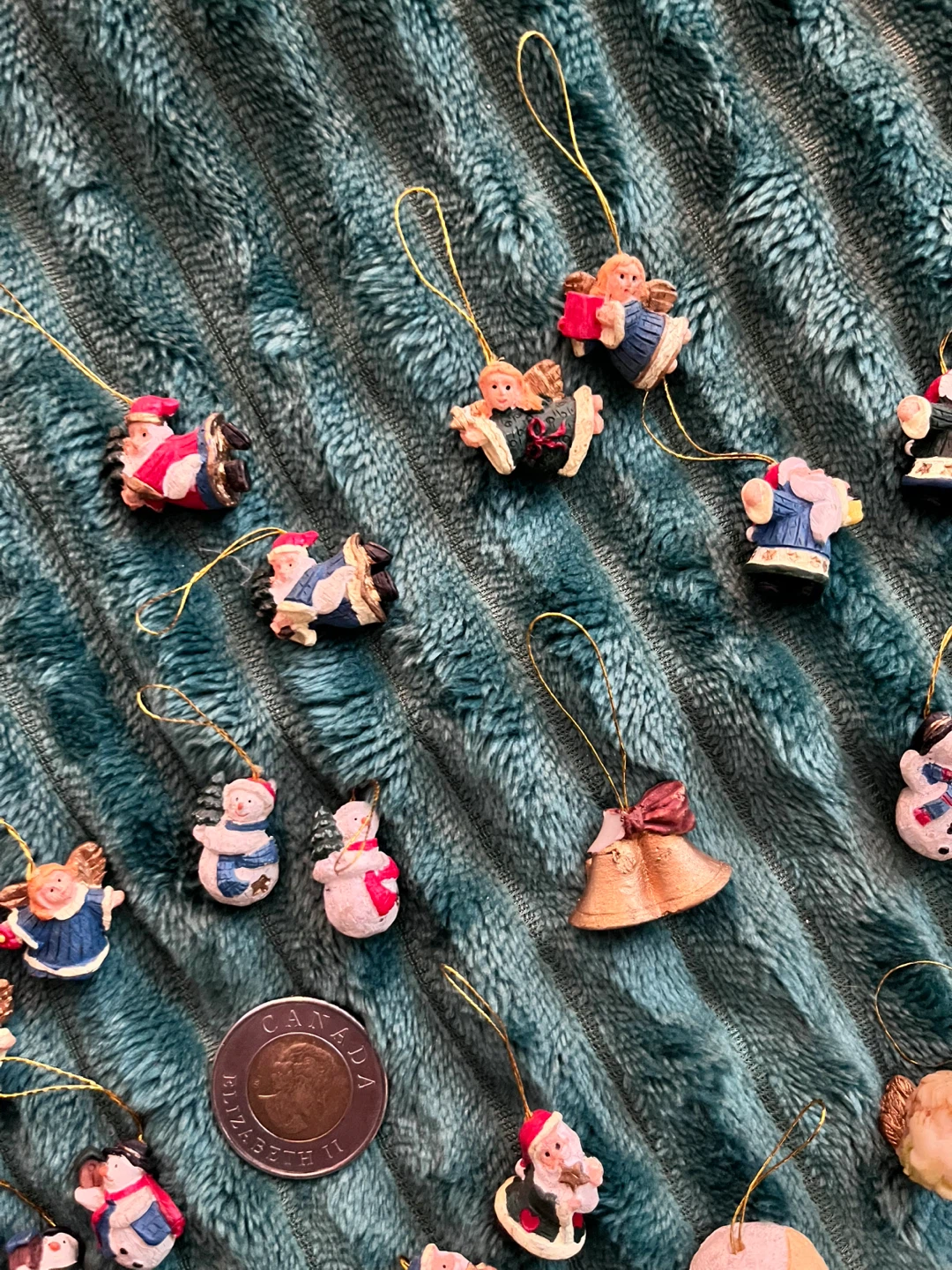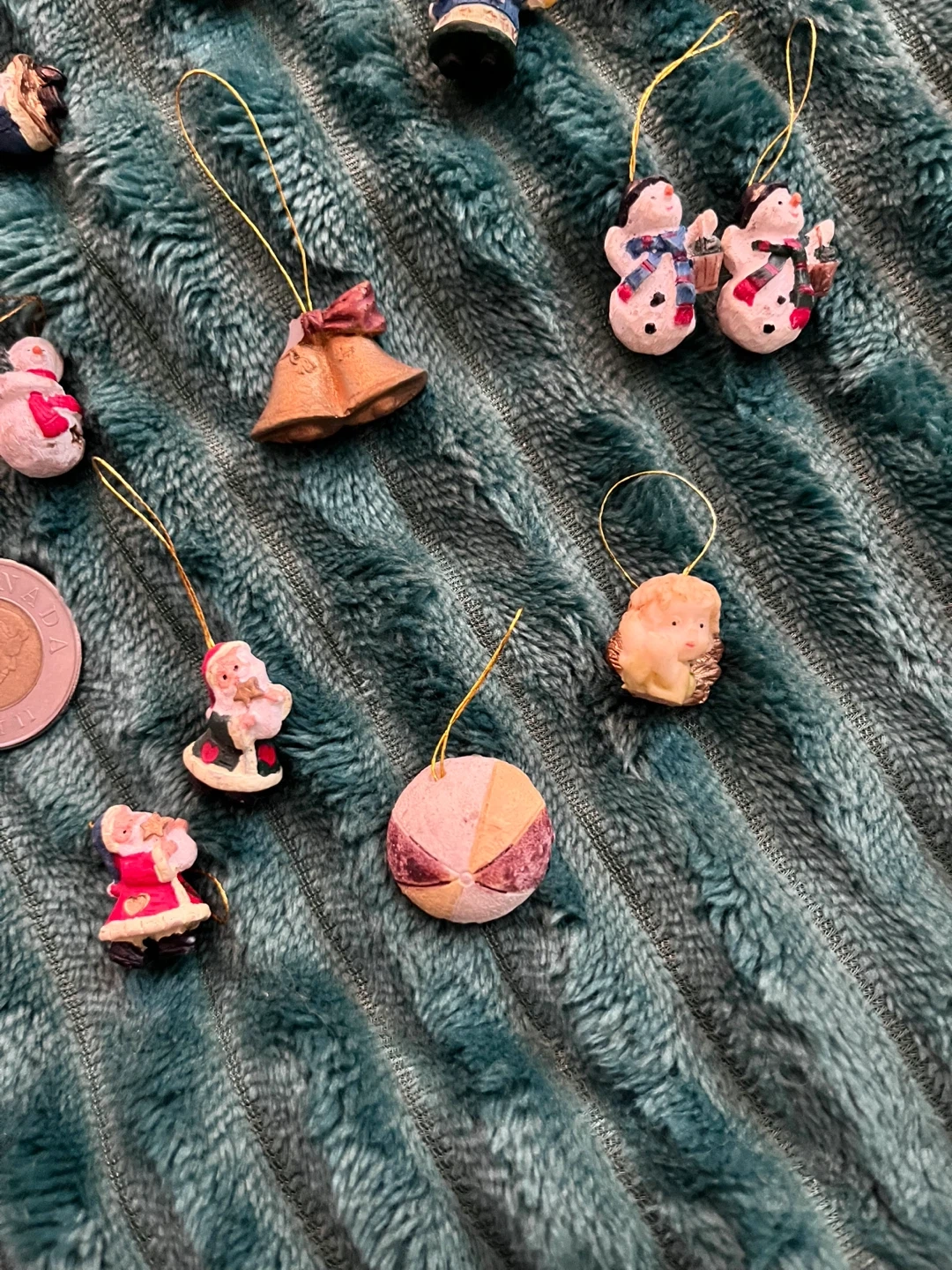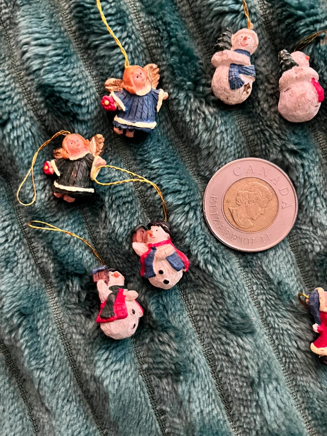 A mixed lot of tiny Christmas ornaments from the late 80’s/early 90s! Includes snowmen, angels, Santa, and more. Toonie for scale. Perfect for decorating your tiny tree. Selling as a lot.