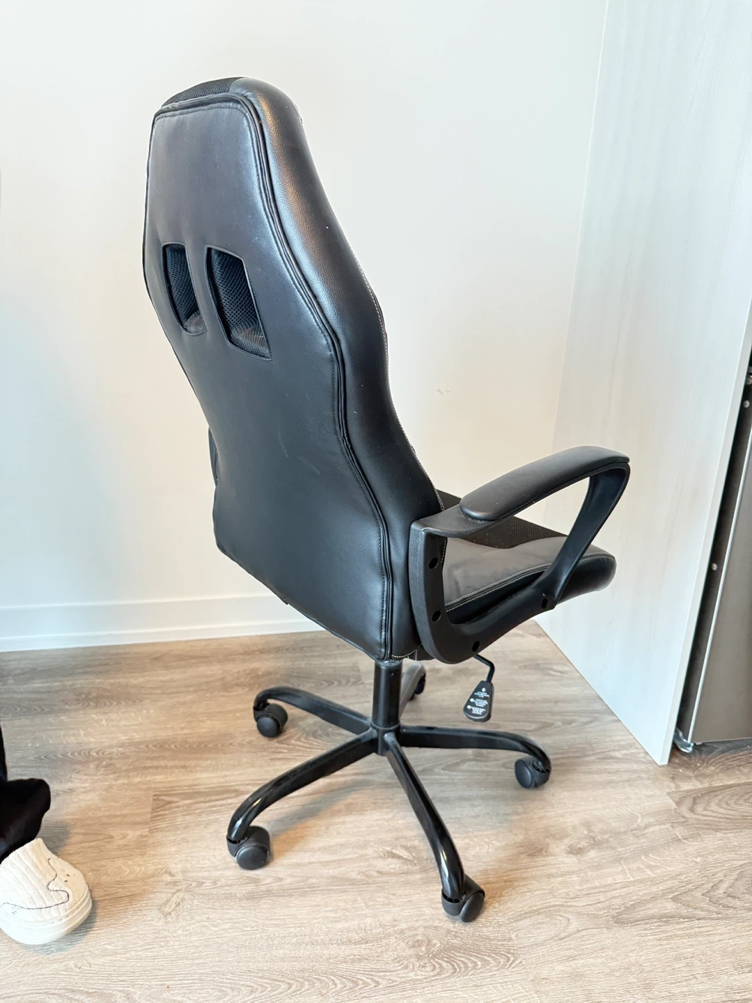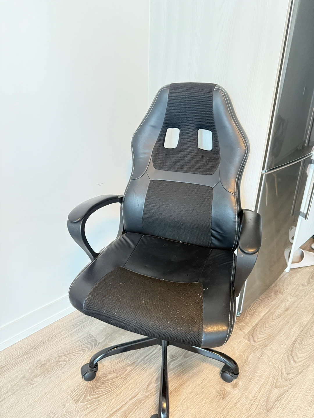 This black gaming still works perfectly for sitting, but some wheels need replacement. A great opportunity if you want a solid chair for your home or gaming setup at a fraction of the price