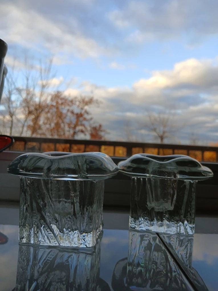 Hand crafted and mouth blown in a distinctive Mushroom shape with a beautifully textured "brutalist" or "icicle" style base. An absolutely stunning light reflection, as in my photos.