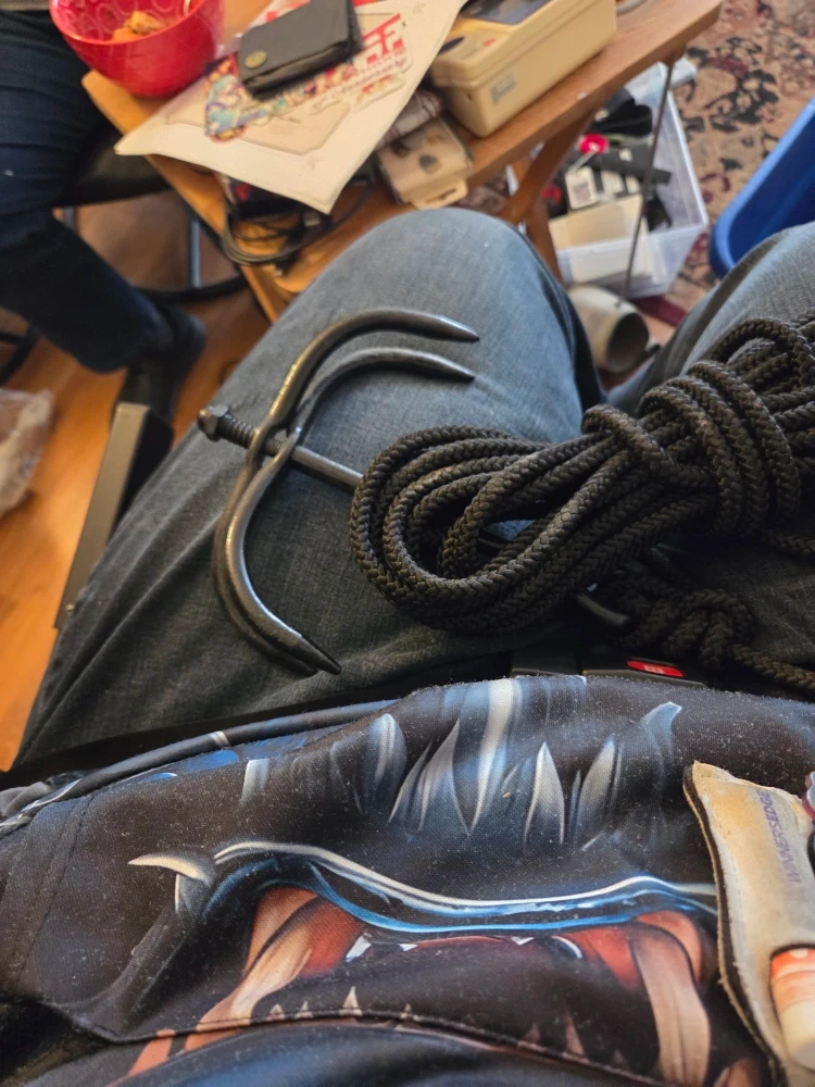 Cleaning up a closet from a friend's place and we came across some climbing material.This grappling hook is in good condition.No rust?And the rope is in great condition as well, barely used.Asking for best offer.