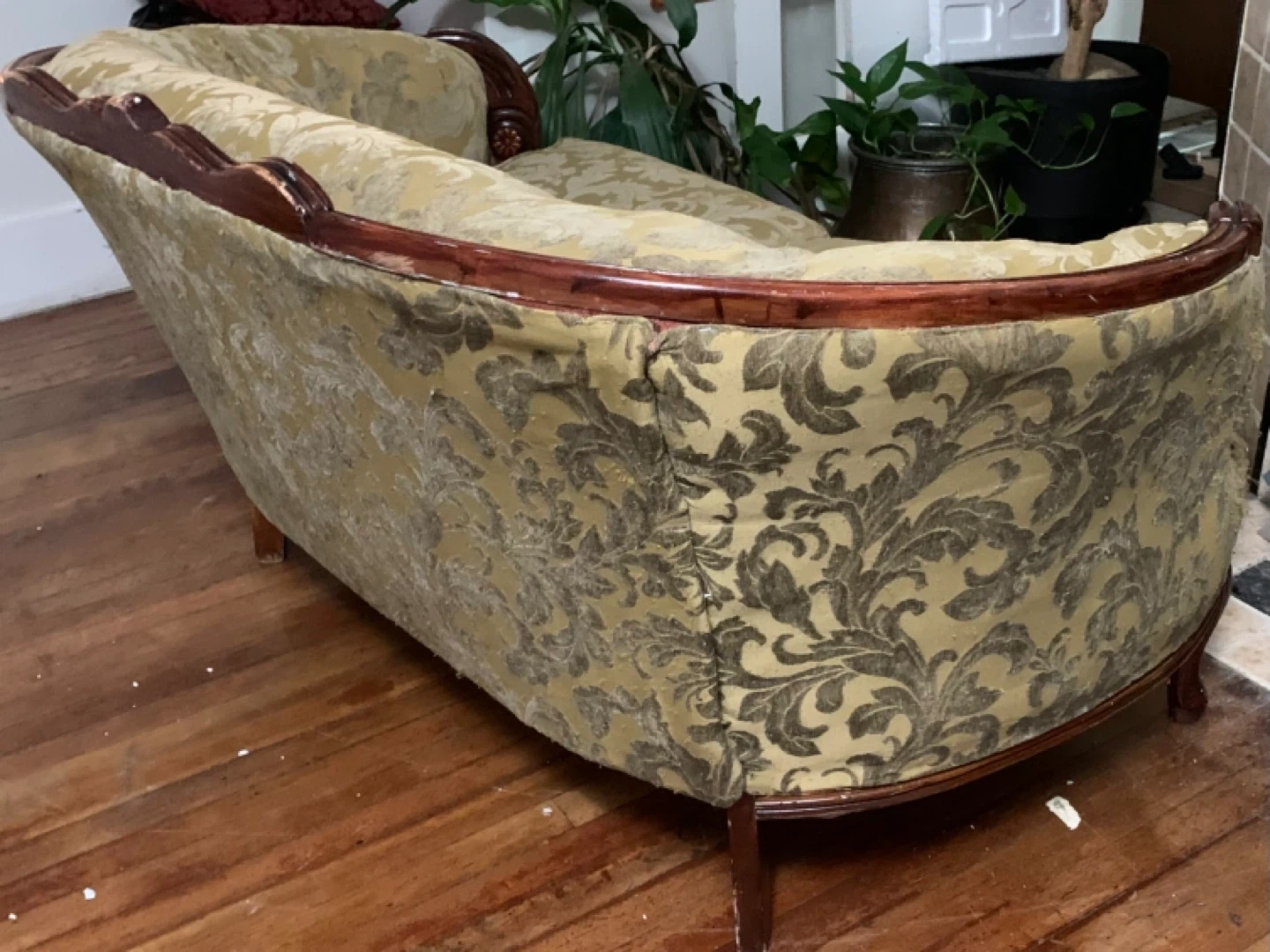 For free a vintage loveseat with a beautiful floral pattern. It has a wooden frame and is in good condition for its age. It would be a great addition to any living room or bedroom!