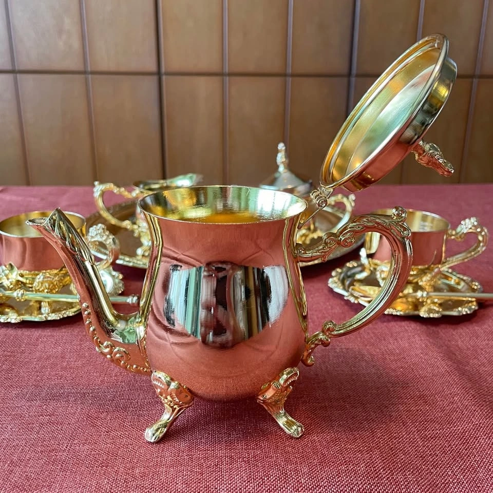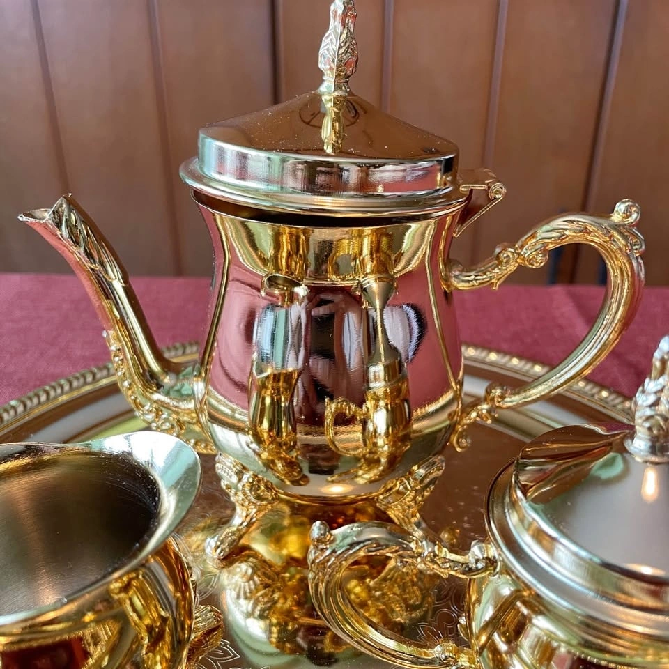 A breathtakingly beautiful vintage tea set with luxurious ornamental detailing and a timeless, elegant look. The rich gleaming finish with elaborate rococo-style ornamentation on every piece – pure elegance and luxury.