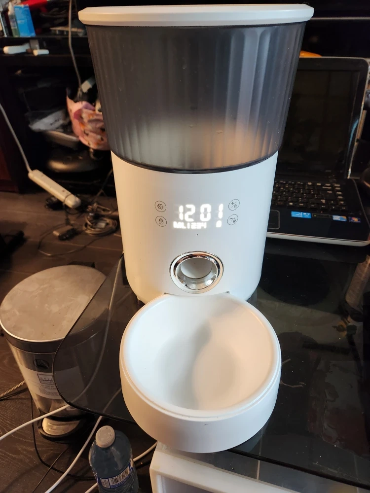 I'm selling an automatic pet feeder! It's in great condition and ready to use for your furry friend. The feeder is white and features a digital display.