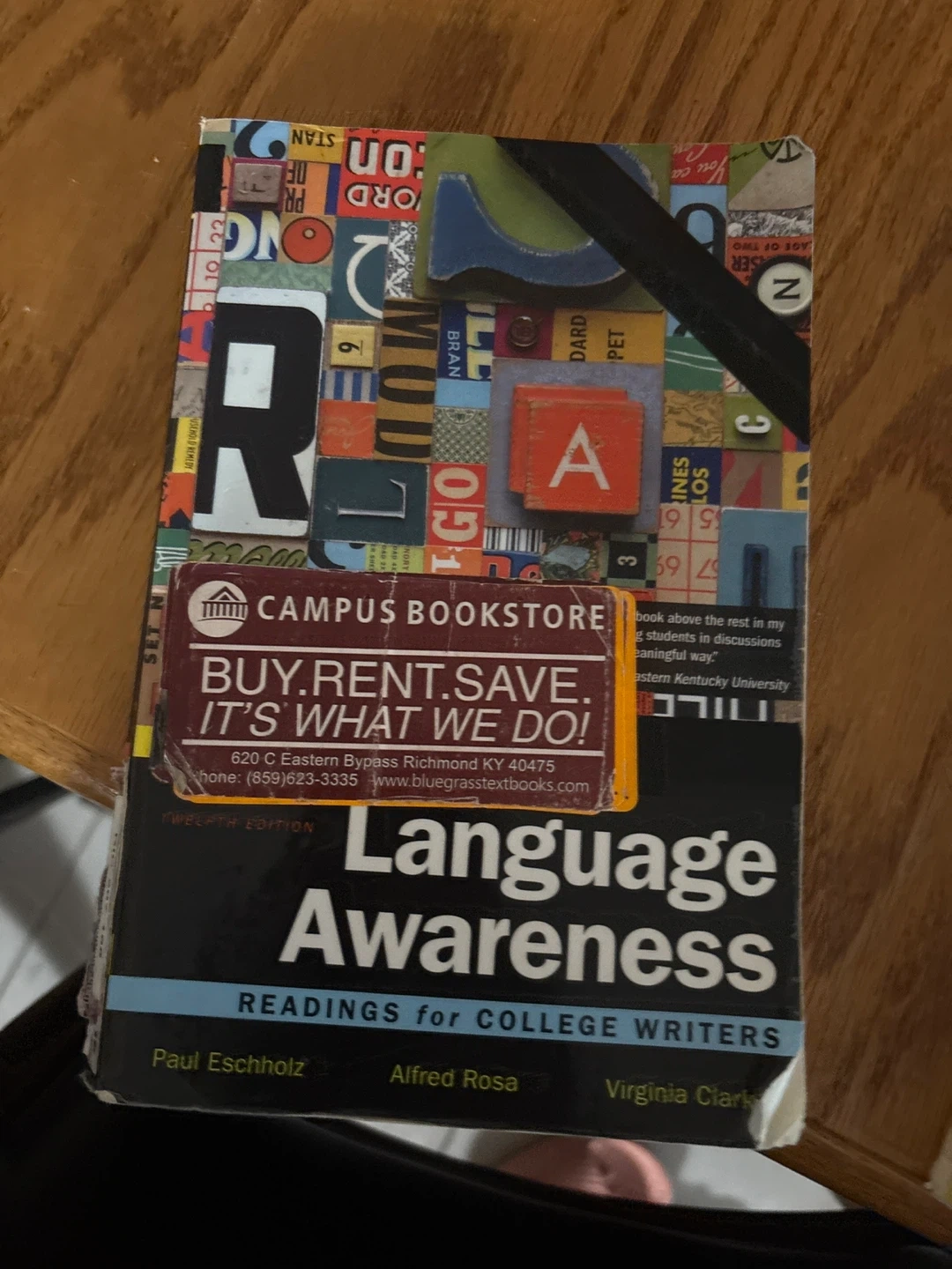 Selling a copy of "Language Awareness: Readings for College Writers," Twelfth Edition by Paul Eschholz, Alfred Rosa, and Virginia Clark. It's in good condition and ready for its next reader!