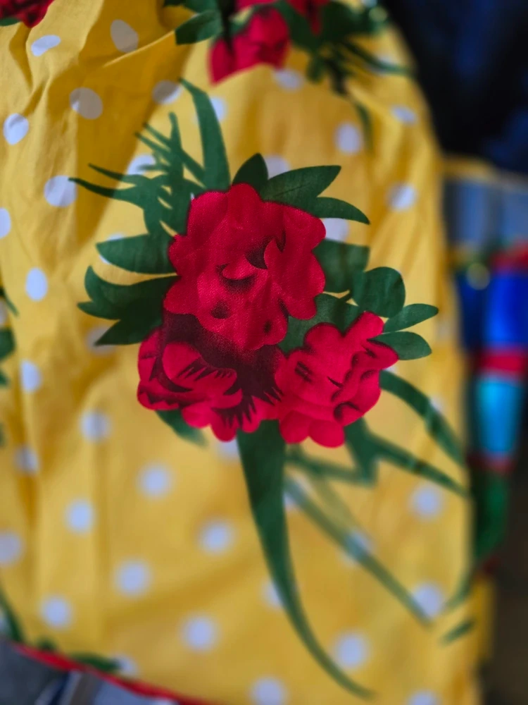This is a handmade ribbon skirt with a yellow background and red roser pattern. It features vibrant ribbons in red, orange, yellow, green, blue, and grey. Has not been worn.It is brand new.