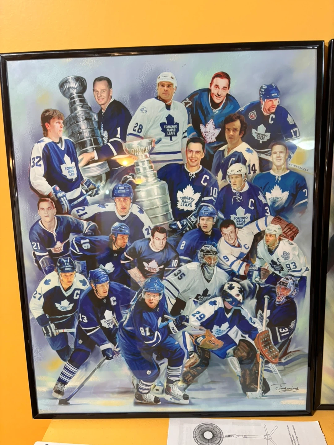 Selling a framed print featuring a collection of Toronto Maple Leafs players. It's in great shape and ready to hang in your home or office. Perfect for any Leafs fan!
