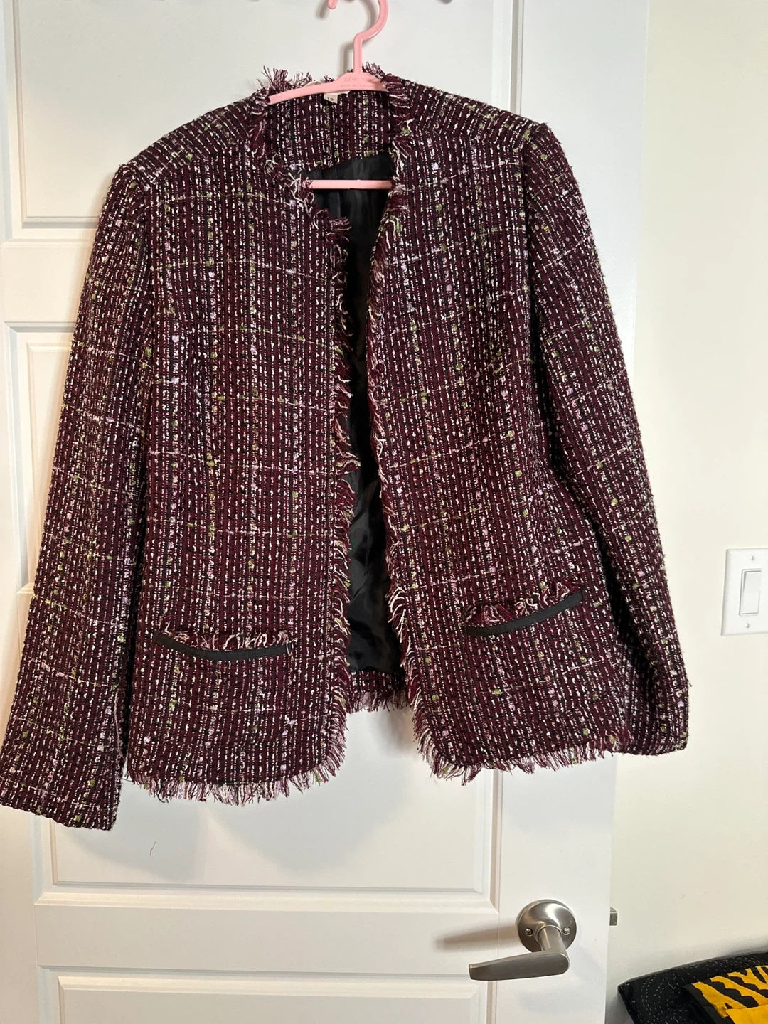 Selling a Tradition tweed jacket in size 12. It features a unique tweed pattern with burgundy, white, and green accents. The jacket has a collarless design and two small front pockets with ribbon detailing. Perfect for adding a touch of sophistication to any outfit!