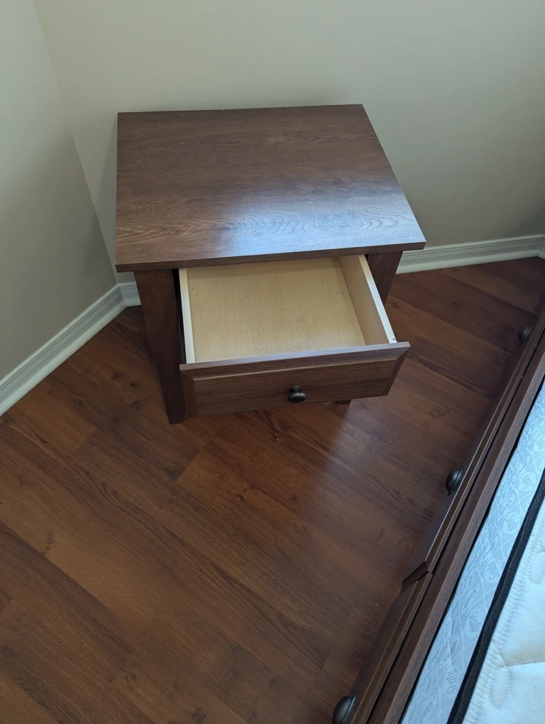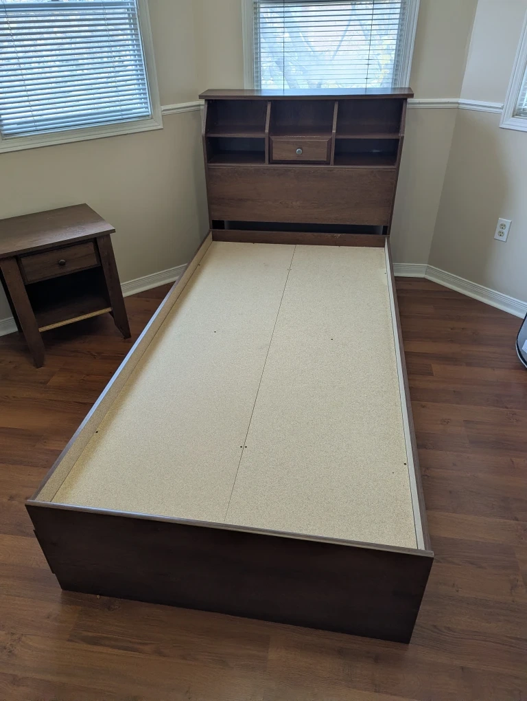 Selling a twin size bed frame in good condition! It comes with a matching nightstand. The bed frame has a headboard with built-in shelves and a drawer, plus storage drawers underneath the bed itself. Mattress included!