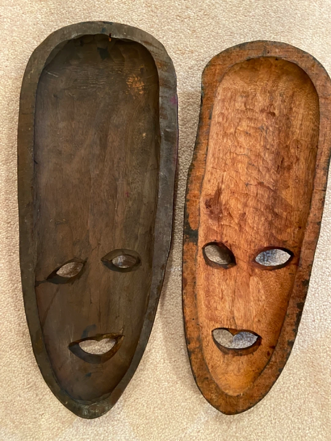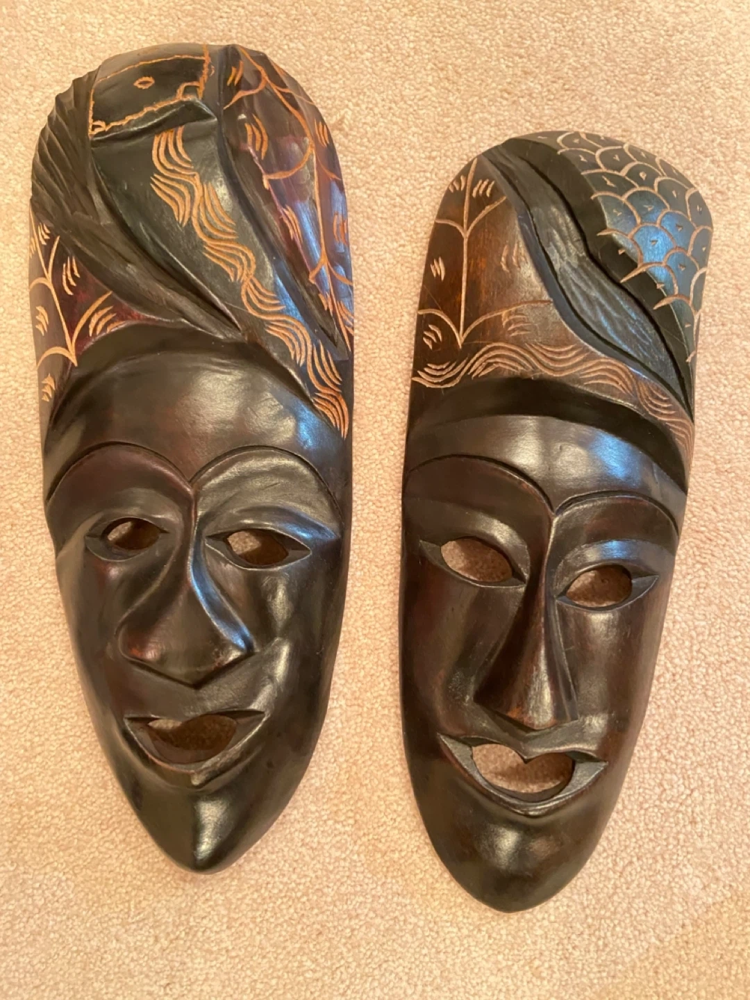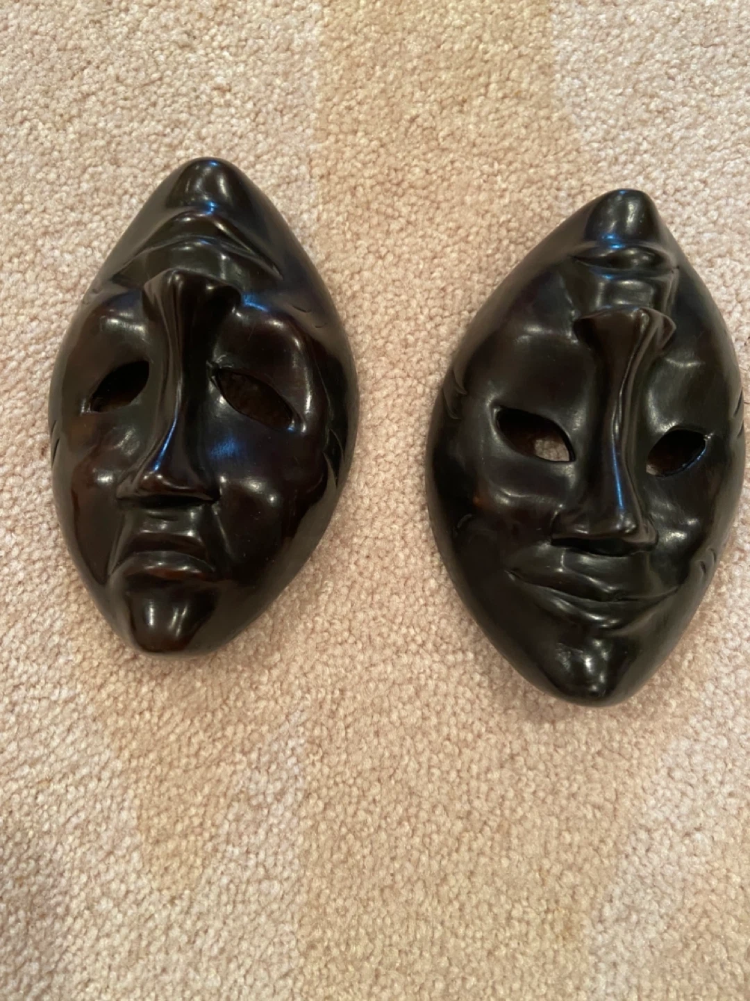 Selling two vintage wood masks. They are intricately carved and in good condition. Also included are 2 pottery-style masks which have faces on either end (can be hung either way).