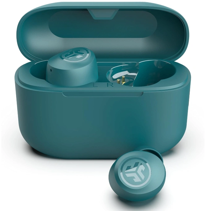 Compact and comfy JLab GO Air POP true wireless earbuds in the Teal color. Work great, cleaned and ready to pair. Case has the handy built-in USB charging cable, so you can top up anywhere.
