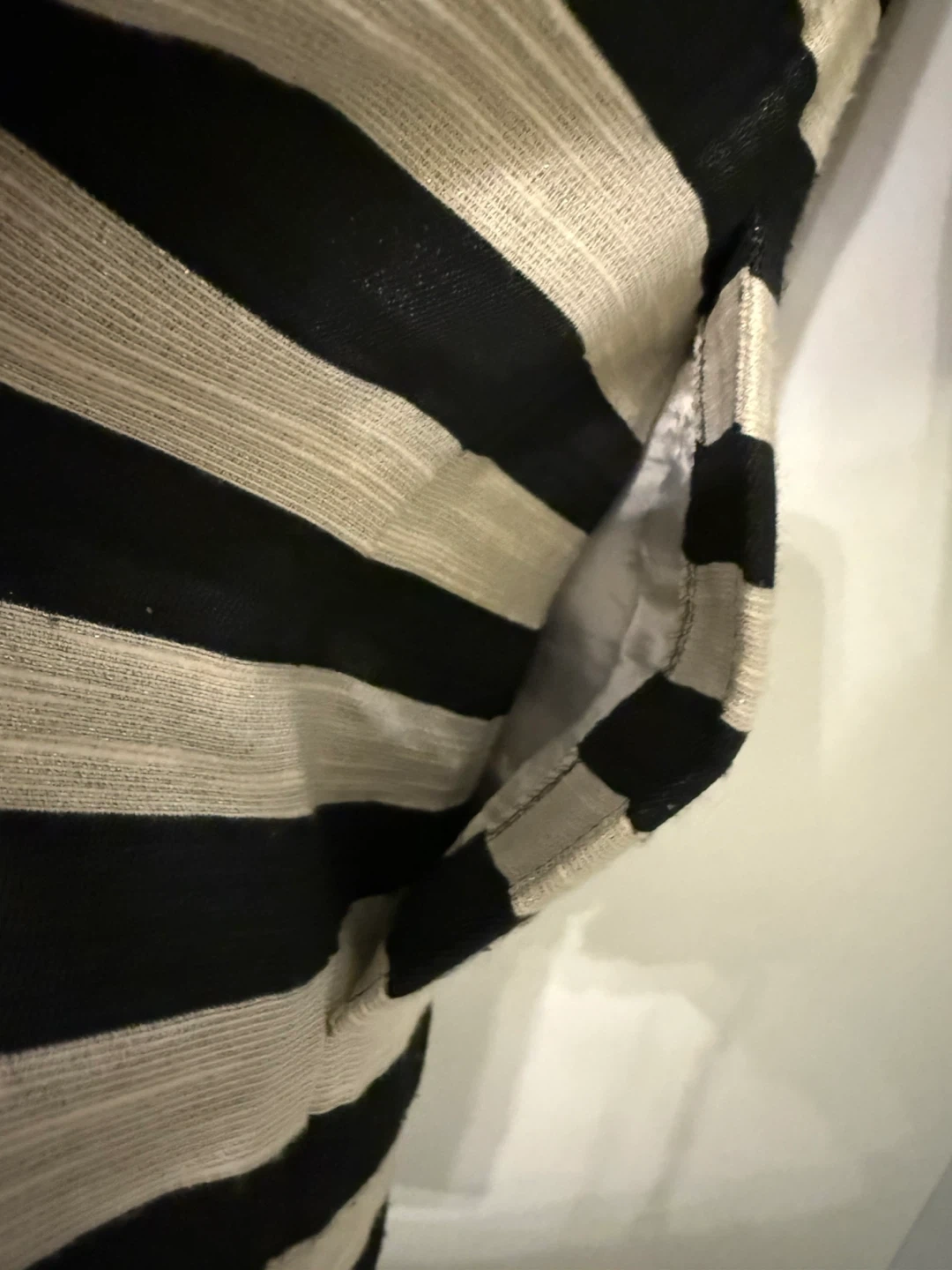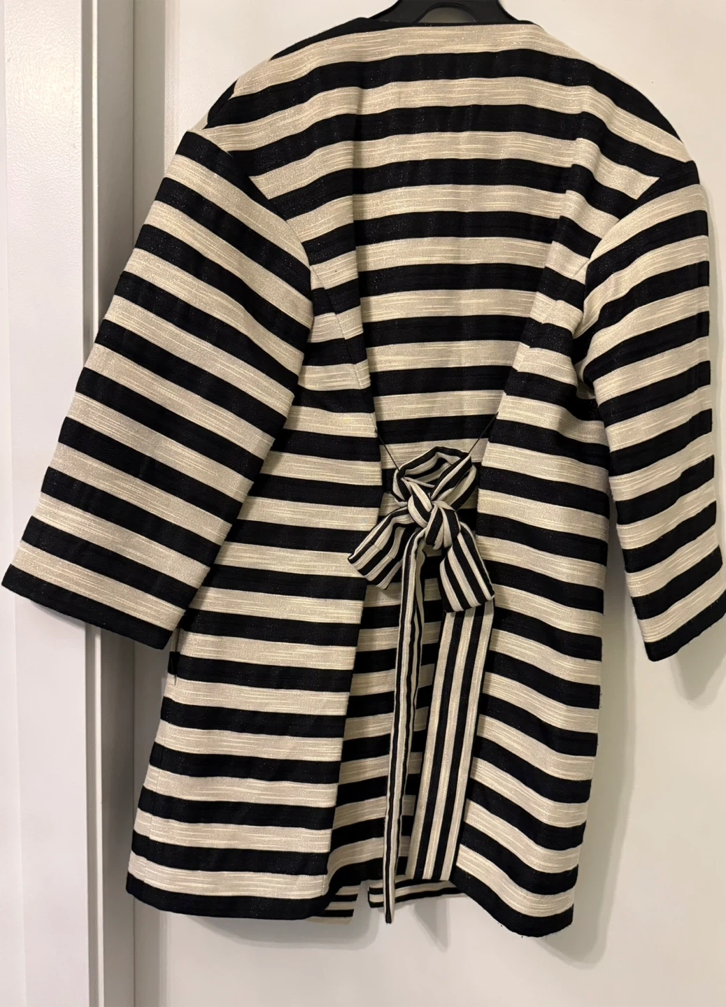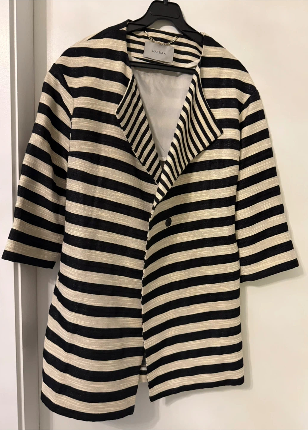 Here's a stylish Marella jacket with a striking black and white striped pattern. It's perfect for adding a touch of sophistication to your wardrobe. The jacket is in great condition and ready for a new home!